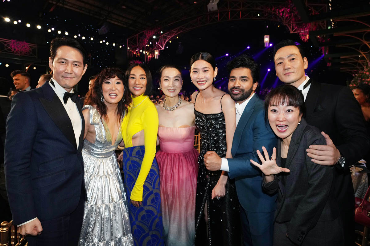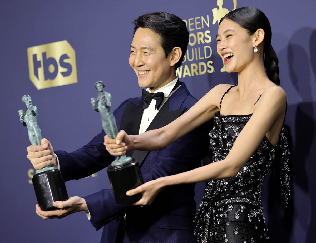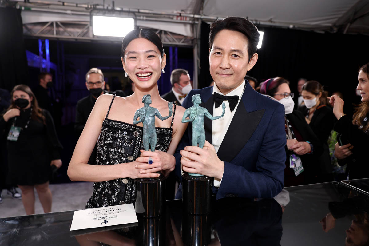 Two years ago, Parasite won the SAG Award for Best Ensemble, the Screen Actors’ equivalent of Best Picture, before going on to win Best Picture at the Oscars. Both at the SAGs and at the Oscars, though, no members of the Parasite cast were singled out for individual acting honours. So it was already noteworthy with the SAG nominations that Lee Jung-jae and Jung Ho-yeon were contending in the lead acting categories. And definitely a big deal that they both won last night (along with the show’s stunt ensemble), making history in the process as the first non-English television series to win acting prizes.
