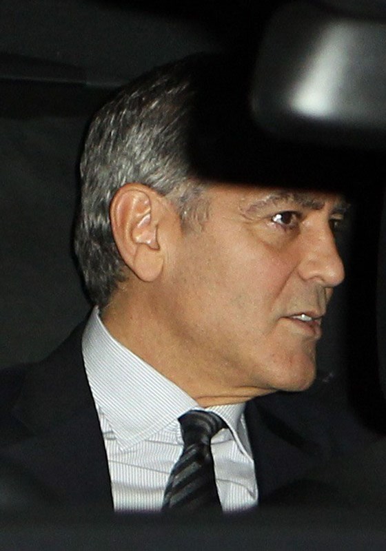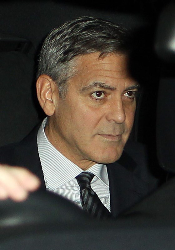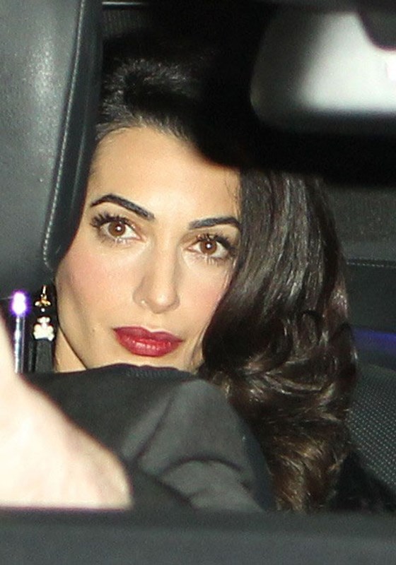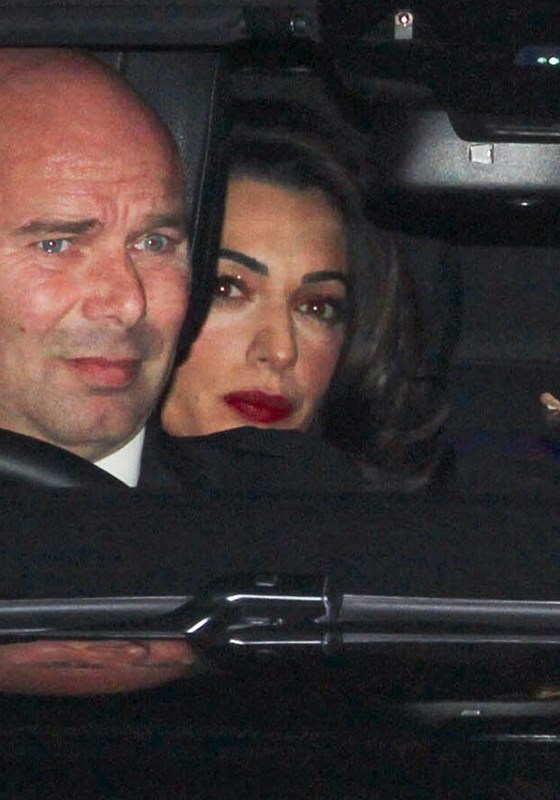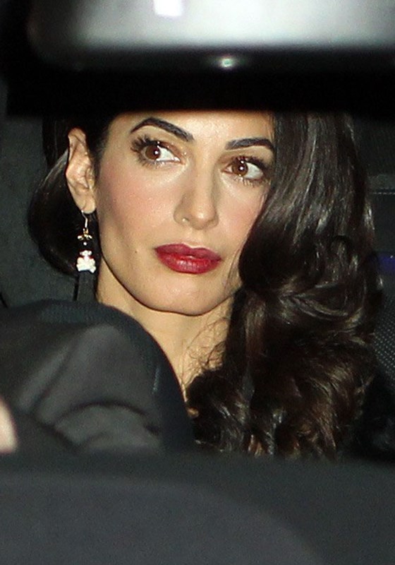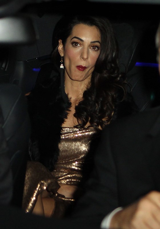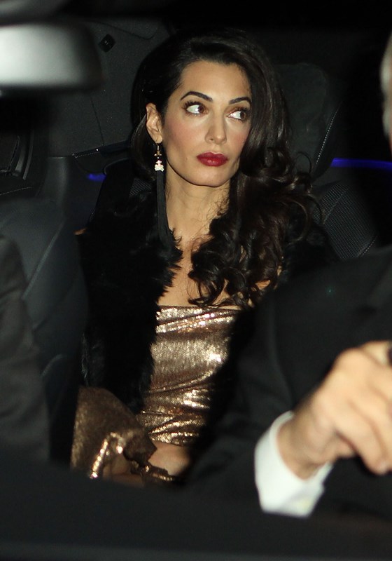 Amal and George Clooney, another wedding reception in England this weekend. She wore gold. It’s a recycle! Last February at the premiere of The Monuments Men, before we knew of her, she was observed on the carpet walking by unrecognised, in the same dress. Click here to see. There’s video.