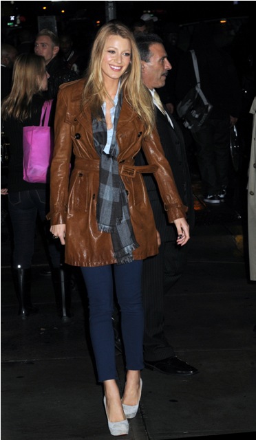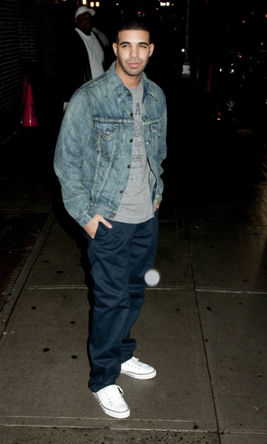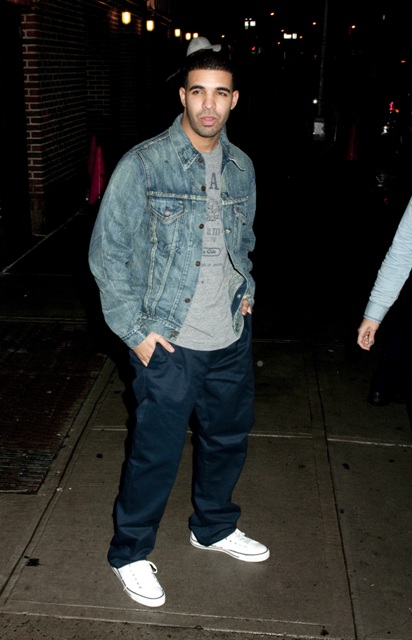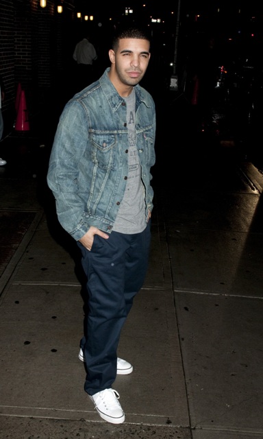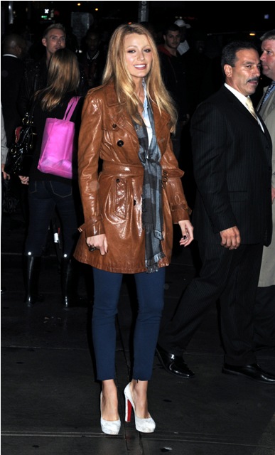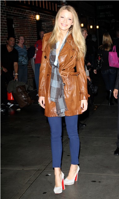 (Quick note from Lainey re: attached photos: Blake Lively in two outfits at Letterman last night. LOVE the bright blue skinny pants and leather jacket. And, just because it’s Duana by Degrassi association, Drake was at Letterman too.)