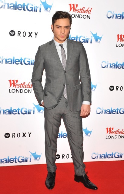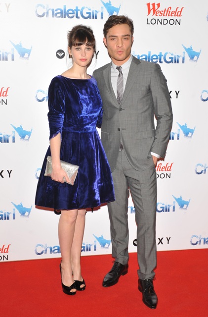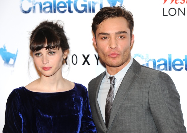 (Lainey: attached – Ed Westwick being grossly and shamefully hot – also ridiculous – in London today at the Chalet Girl premiere with the up and coming Felicity Jones, avoiding America while his ex-girlfriend’s new boyfriend basks in the glow of the Super Bowl.)