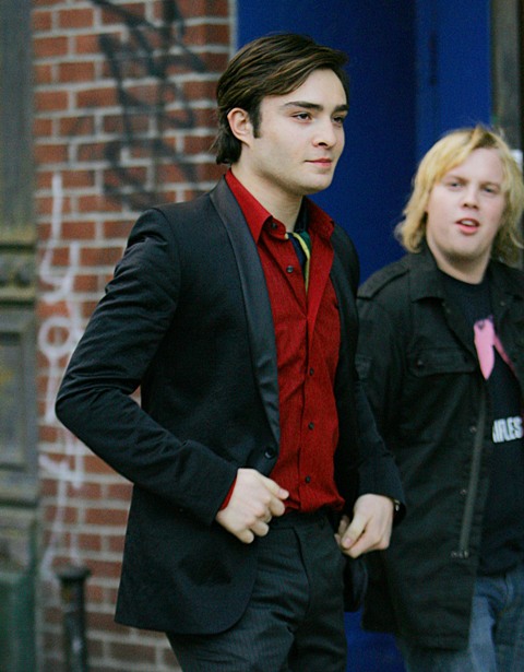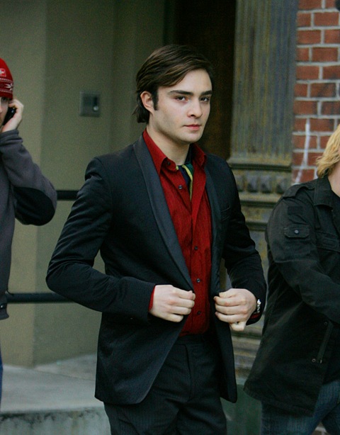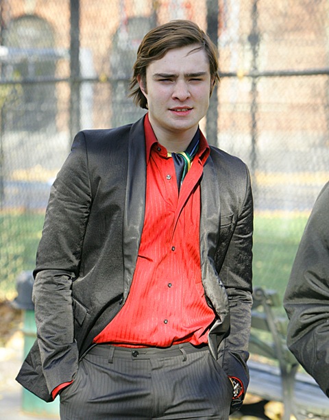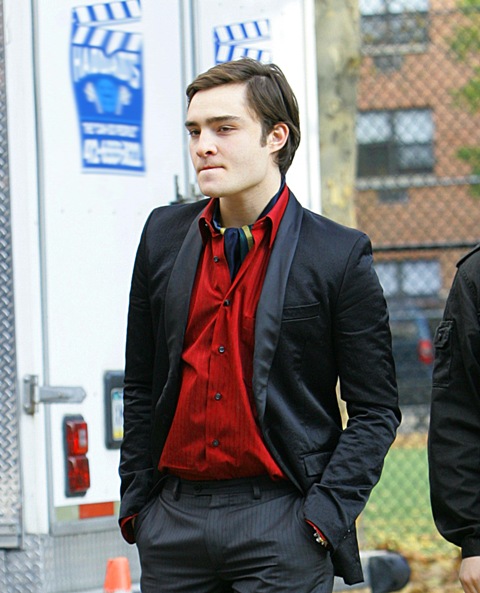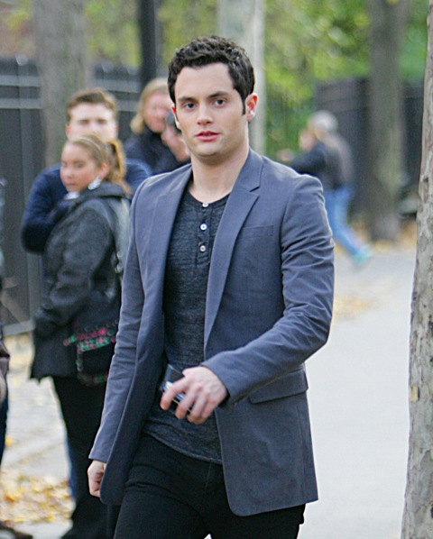 Promo clip is attached. Also, photos of Penn Badgley and his face that doesn’t fit his head on set yesterday along with Ed Westwick in holiday red.