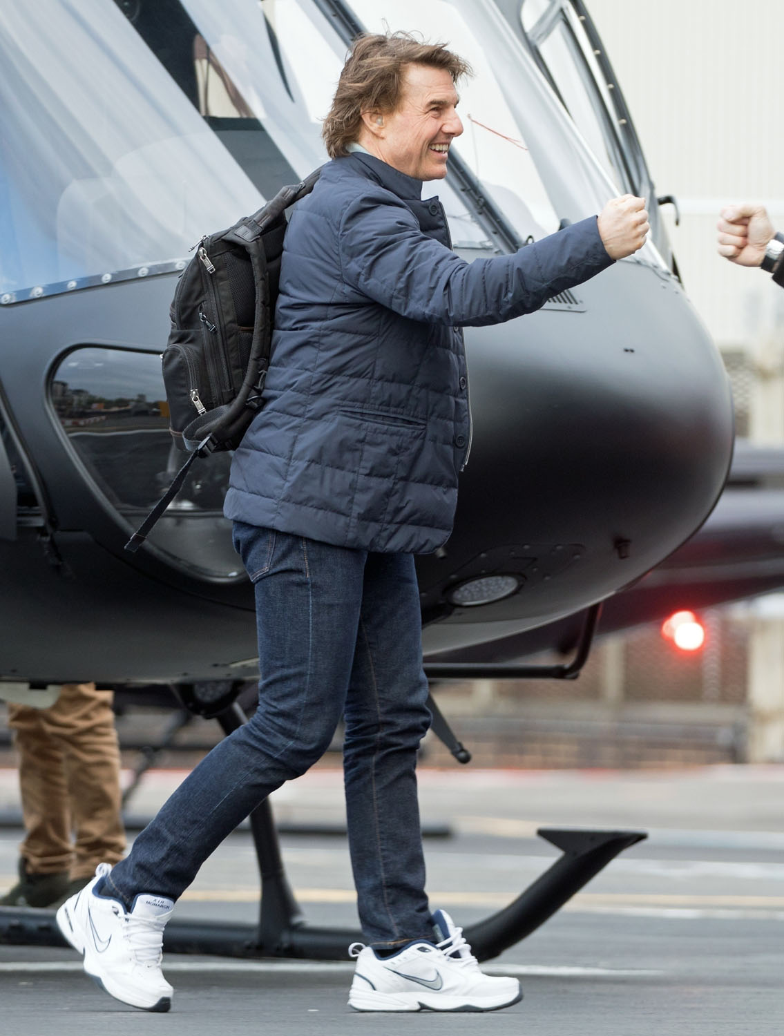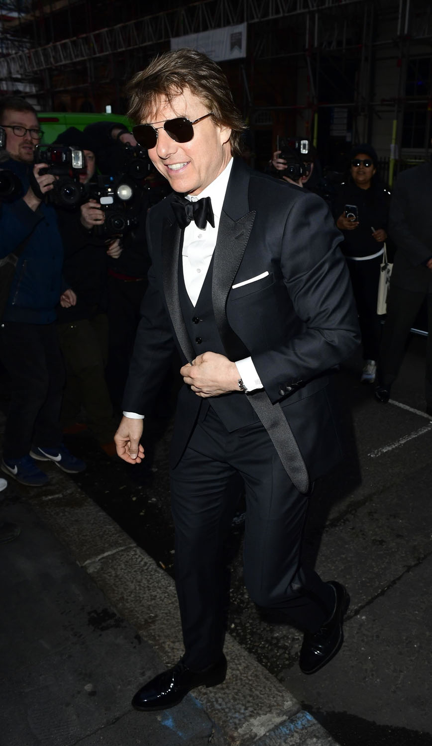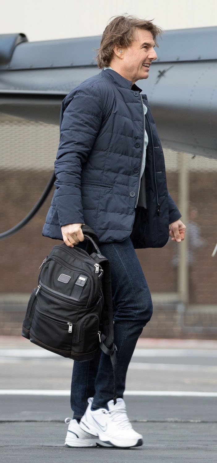 Tom Cruise was photographed taking his preferred mode of travel – by helicopter! – in London today so it gave me an opportunity to post about what I didn’t get around to yesterday: his attendance at Victoria Beckham’s 50th birthday party this past weekend. Katie got Suri in the divorce and he got the Beckhams.