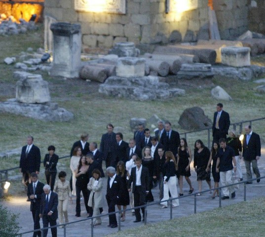 There are two sets - Jen and Brad sightseeing and then hooking up with Bruce Willis (he had an uncredited cameo in O12) and George, who was dating Lisa Snowden (!!!) at the time, for some fancy dinner. I LOVE OLD PHOTOS.