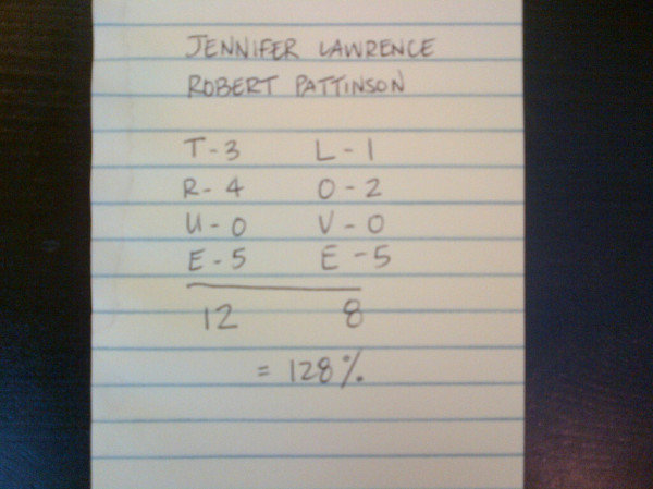 So Jennifer Lawrence + Robert Pattinson = 128%