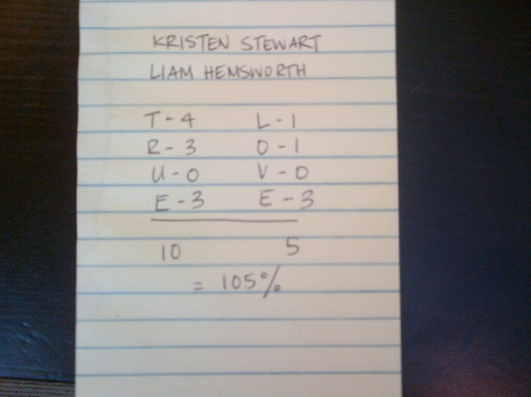 And Kristen Stewart + Liam Hemsworth = 105%