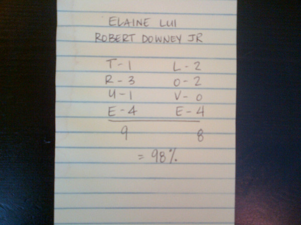 There were rules though. Like the ideal was between this percent and that percent. And over 100% was considered this or that. I can’t remember now. All I know is that RDJ and I get 98%. Unless the “Jr” doesn’t count. In which case, maybe even better = 88%!