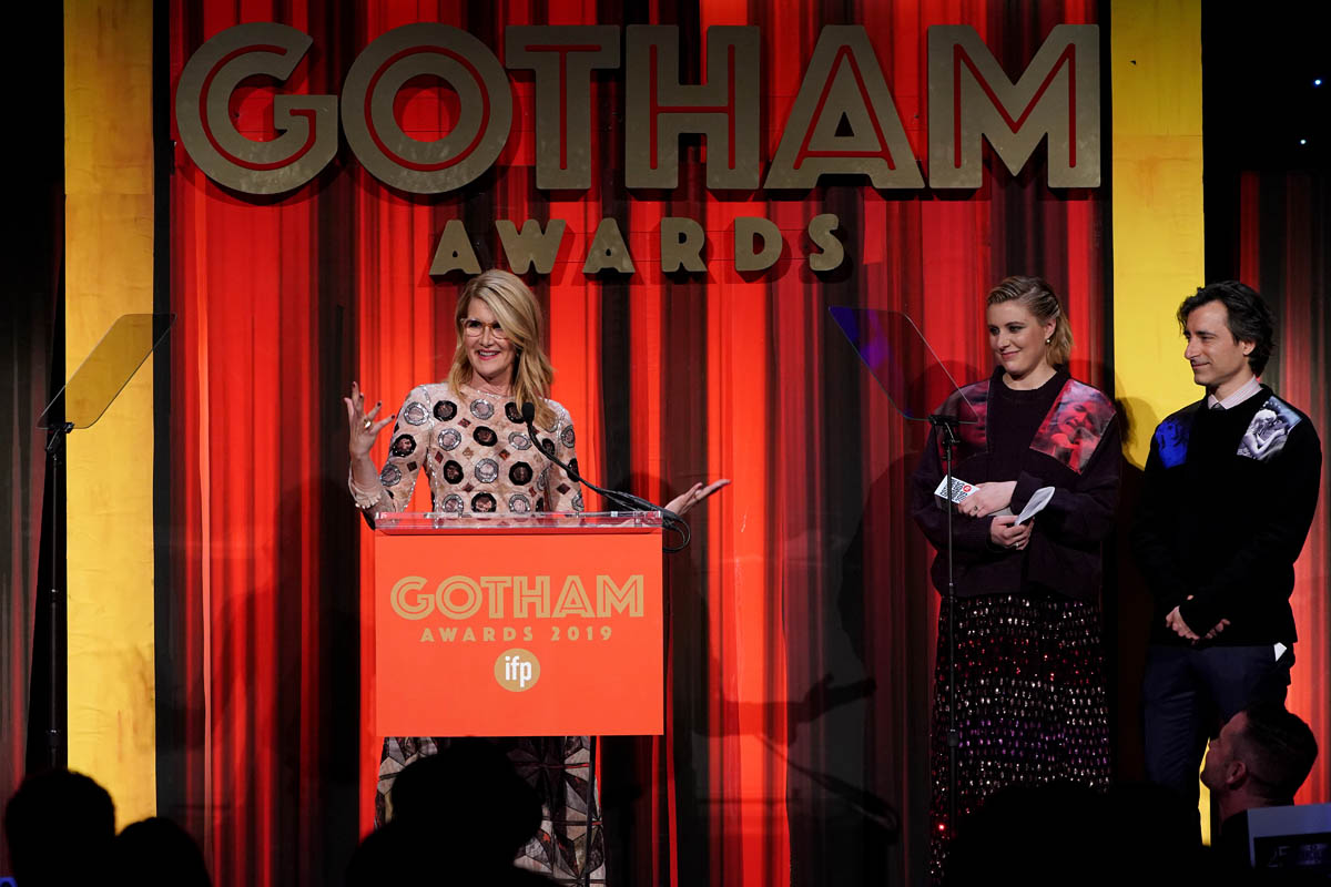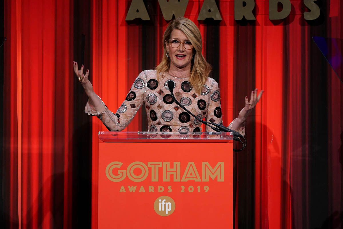 Laura's pre-announced win was set back in September, but her film Marriage Story was the night's trophy leader, winning four awards including Best Screenplay, the Audience Award, Best Actor for Adam Driver, and Best Picture. As Lainey wrote in today’s open, six of the Gotham’s 10 awards went to Netflix productions. Marriage Story had four of those wins. And Variety’s Ramin Setoodeh was quick to point out that Netflix scored the night’s prime real estate, as far as tables were concerned: