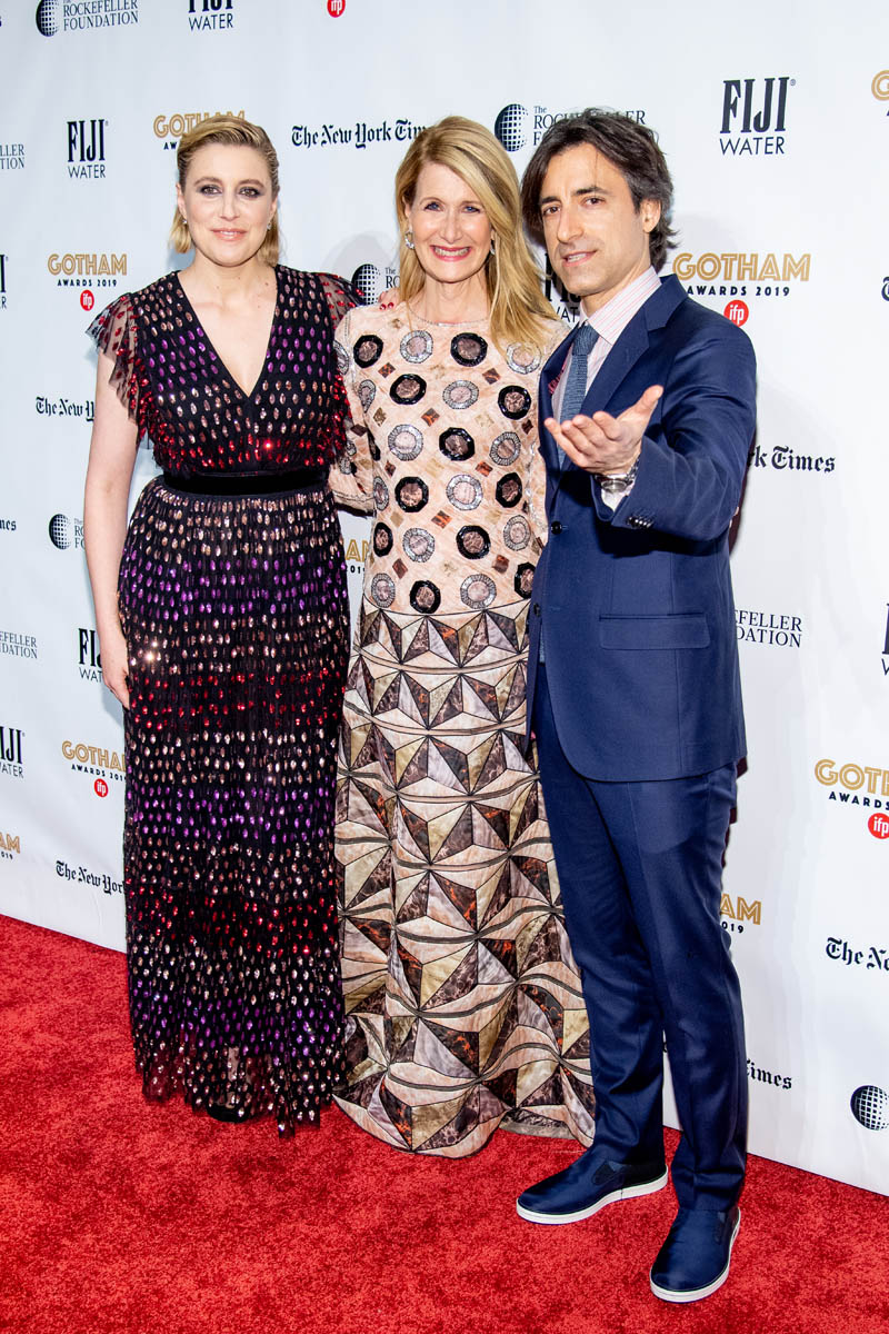 Greta Gerwig and Noah Baumbach wore matching Raf Simons Laura Dern sweaters while presenting her with a special Tribute prize at the Gotham Independent Film Awards in New York last night. According to Greta, the real-life filmmaking couple had "been looking for an excuse to wear our Laura Dern sweaters" and seized the opportunity. It's a sweet way for these two to honour the actress, whom they both worked with this year separately in Greta's Little Women and Noah's Marriage Story; but it's also a nod that's so niche and lighthearted that it feels almost like self-parody of their Laura fandom, or that it was pulled from a Portlandia or Saturday Night Live sketch. Not that I'm complaining. I love these two. And the couple that campaigns together — for their shared actress — only elevates their projects, right? Even when Little Women’s release is still weeks away?