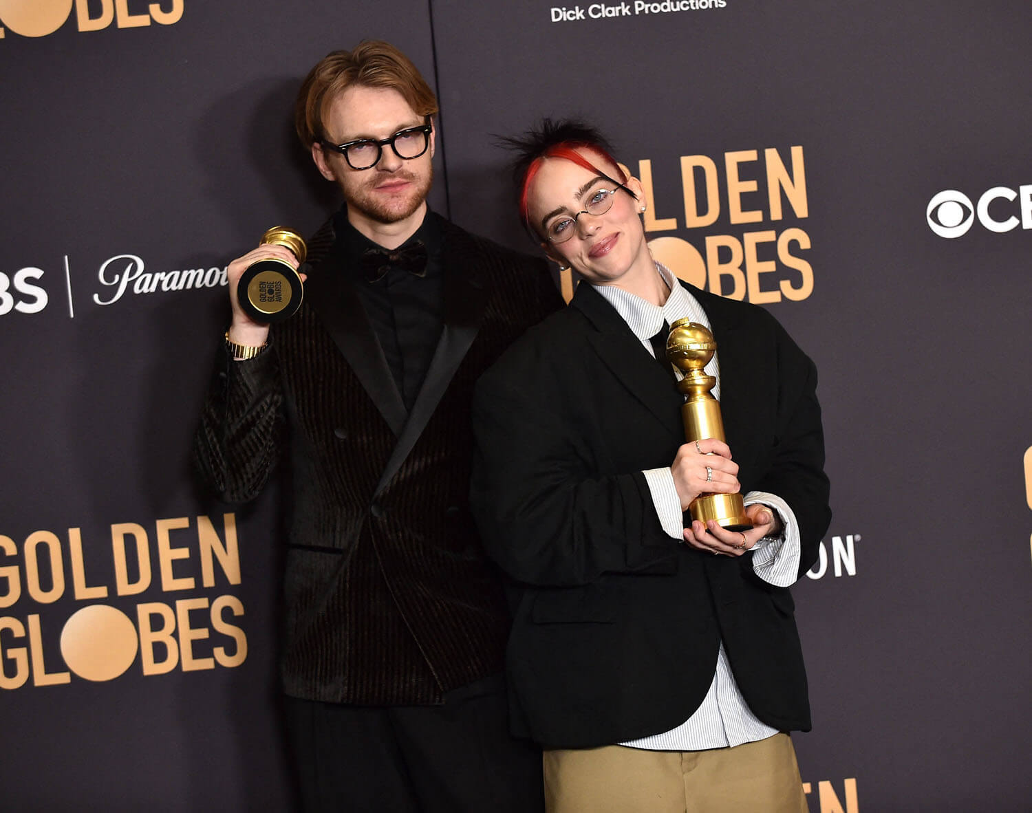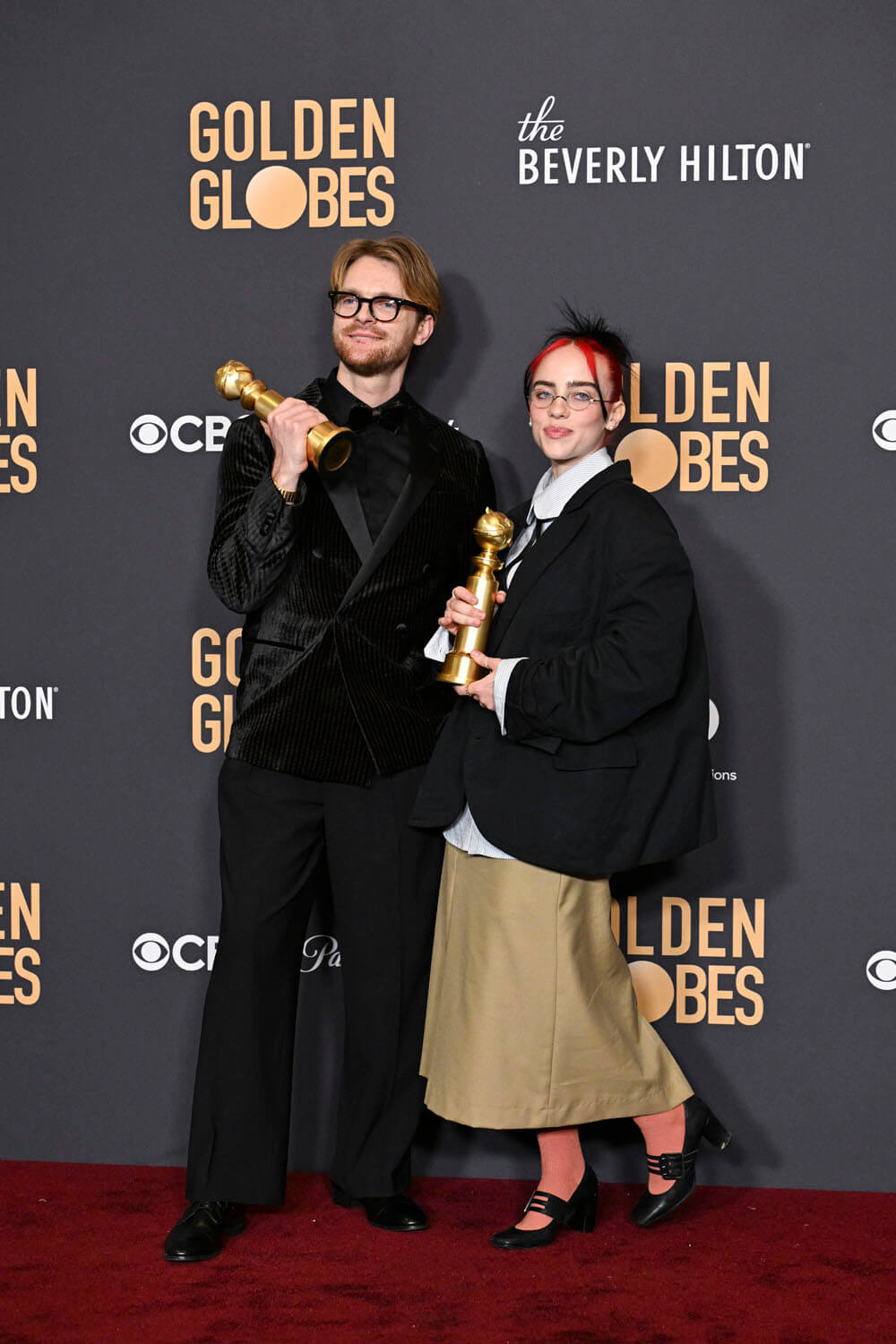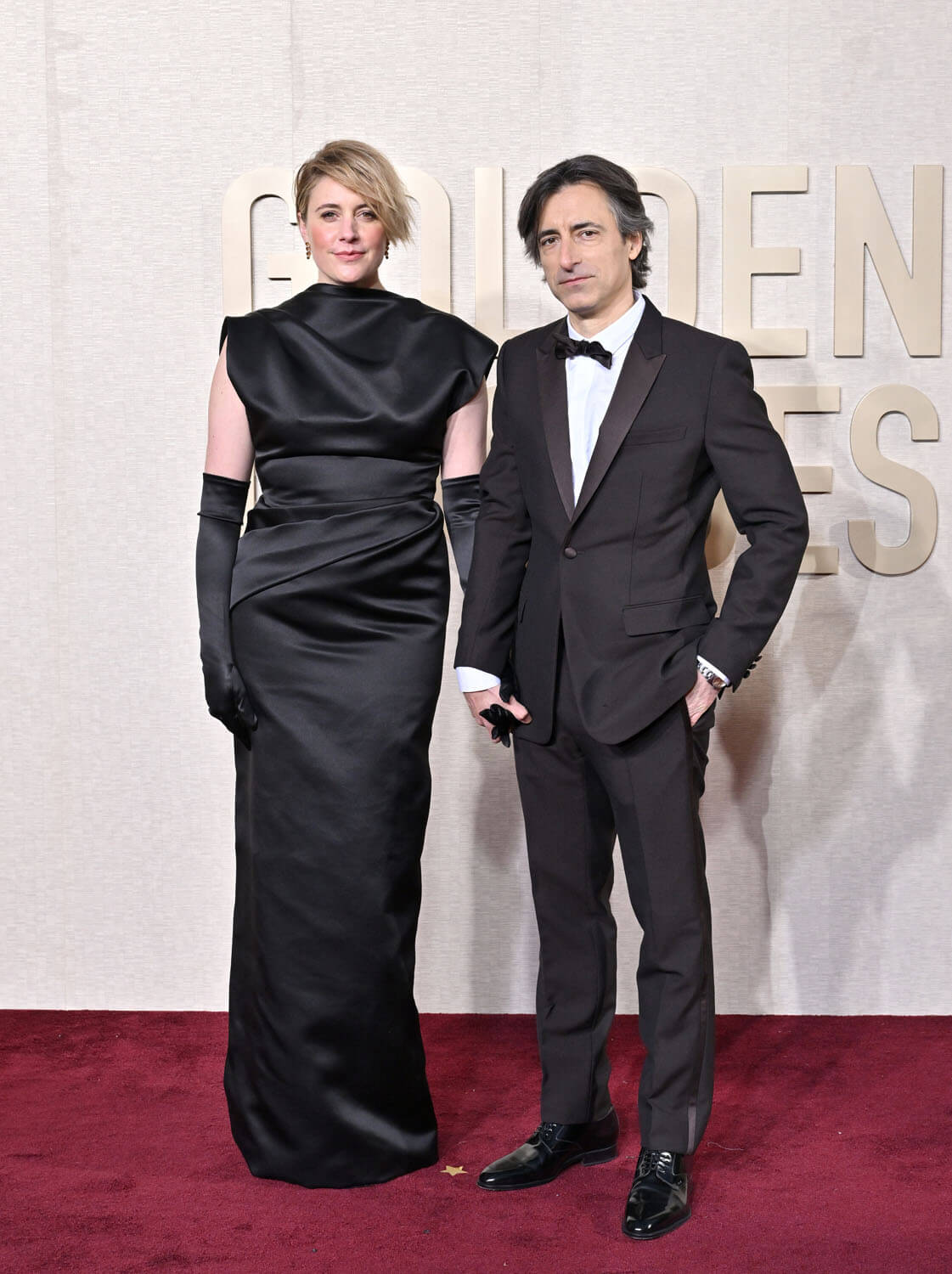 Director Barbie herself, Greta Gerwig, wore a black satin gown with opera gloves. It’s very “dahling, welcome to the dinner pah-tee”. Her collaborator and husband, Noah Baumbach, looked better suited to the Oppenheimer table in a standard tux, and Hari Nef and Dua Lipa sort of blended into one red-headed figure in a black dress. Finneas also wore plain black, but Billie Eilish wore an outfit (by Willy Chavarria) best described as “what if Talking Heads did prep school?”.
