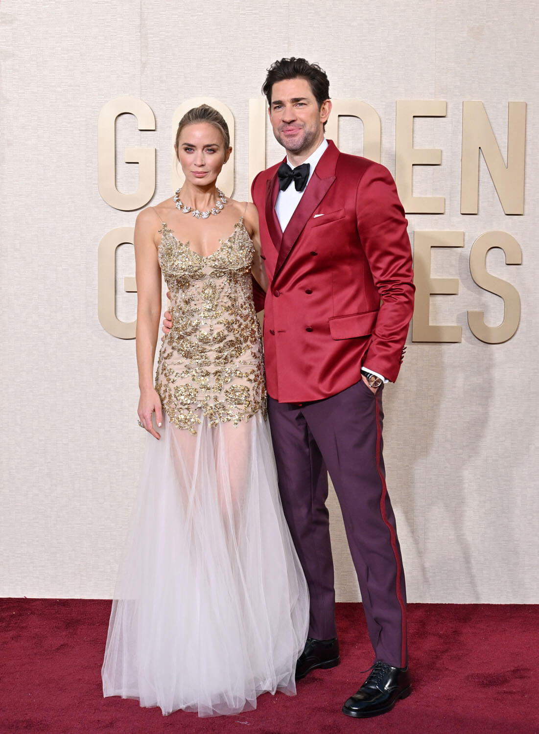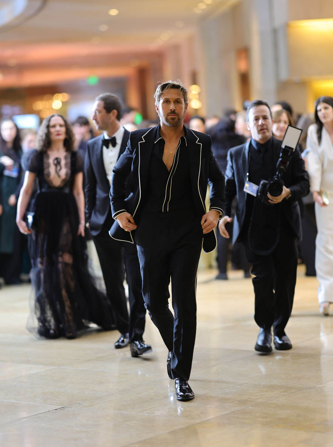 Is it her best look? No, but one imagines she and her stylist, Andrew Mukamal, are saving that for the Oscars. But I’m with Lainey, I hope she gives pink a rest for the next few events. Ryan Gosling, meanwhile, wore a black suit with white piping and a matching, open-collared shirt. It’s like, classy sleazy? But also sort of fancy pajamas?