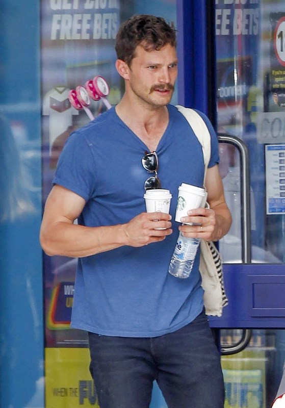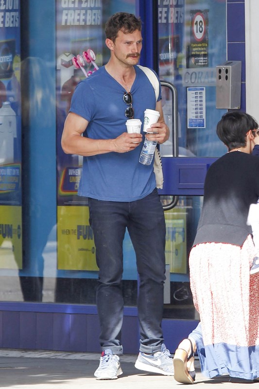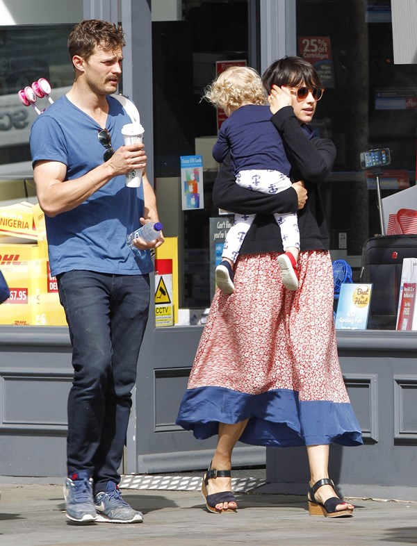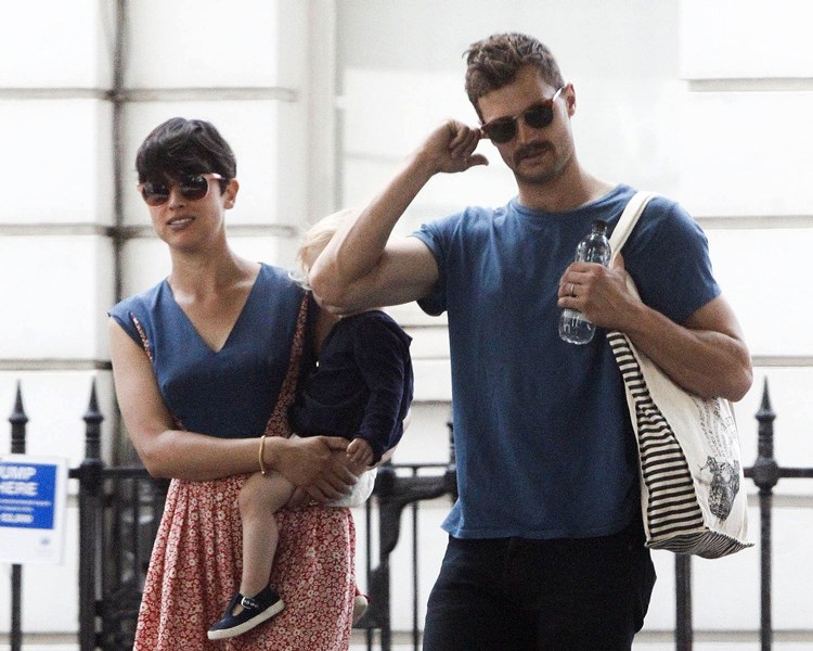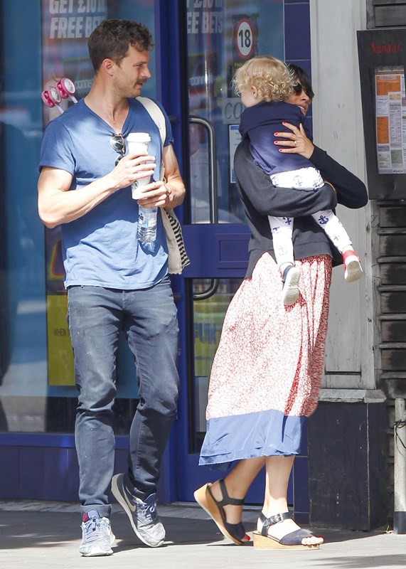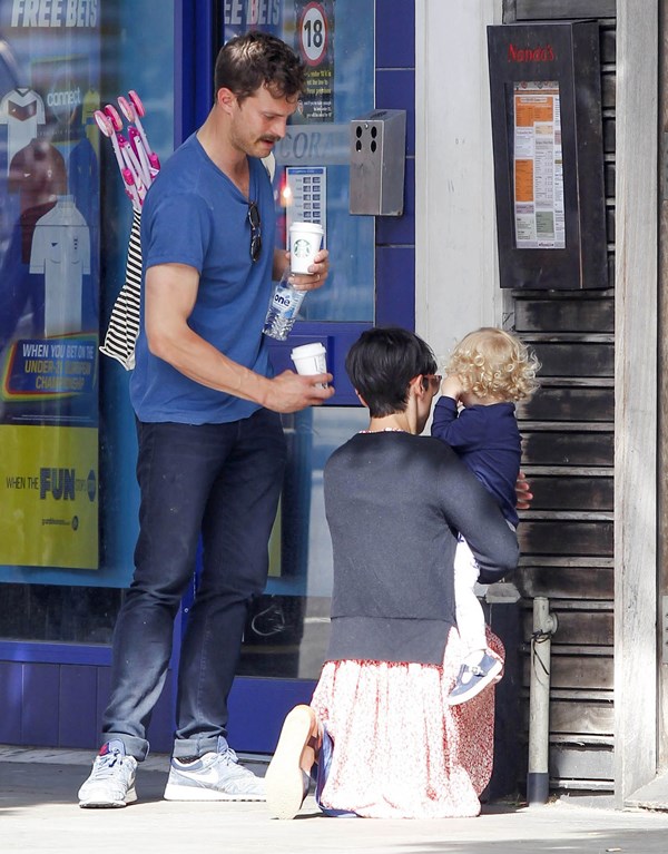 Attached – Jamie Dornan in London yesterday with his wife and daughter.