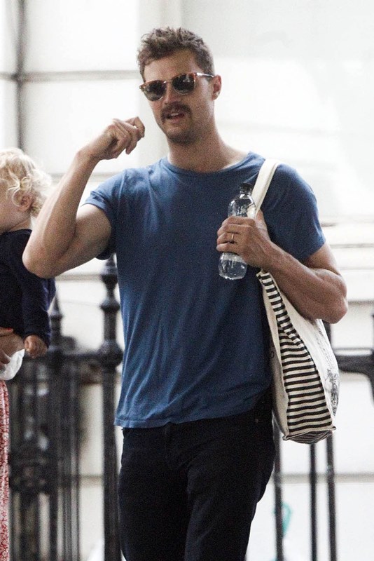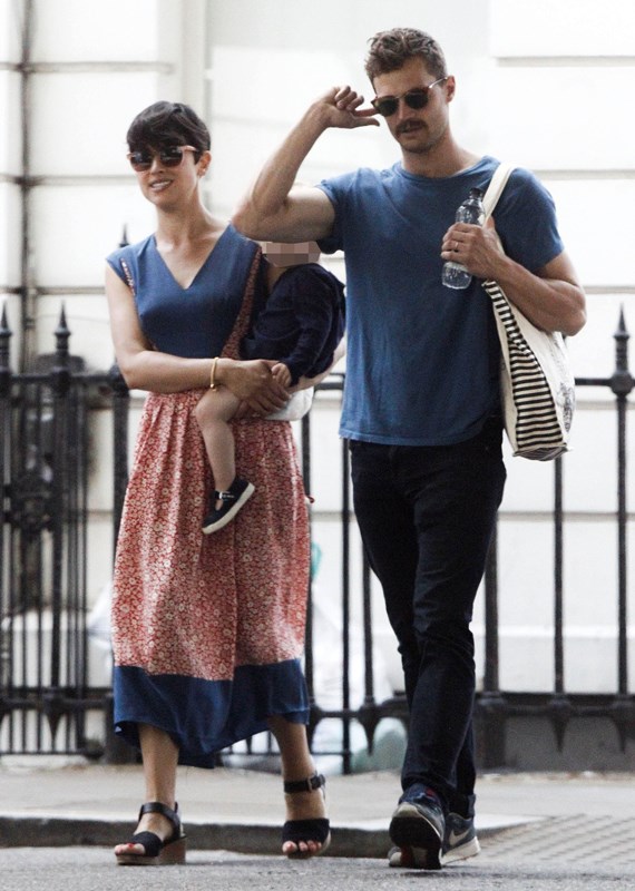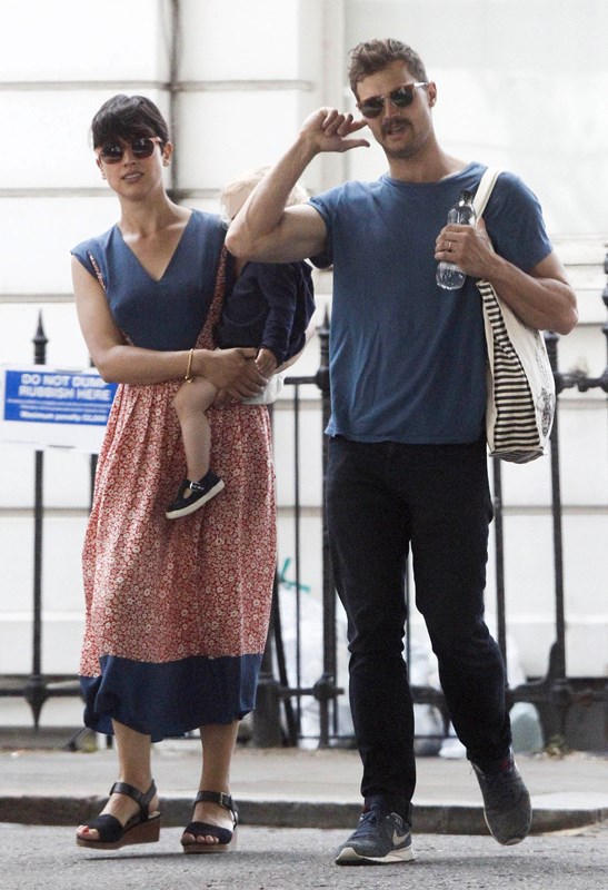 Attached – Jamie Dornan in London yesterday with his wife and daughter.