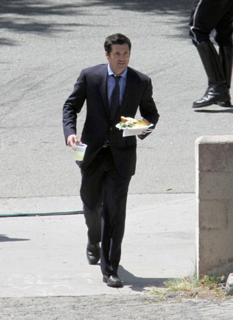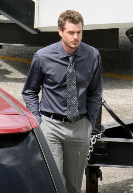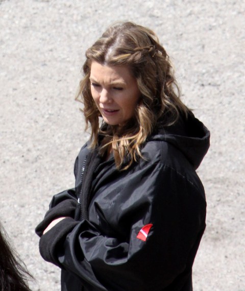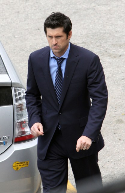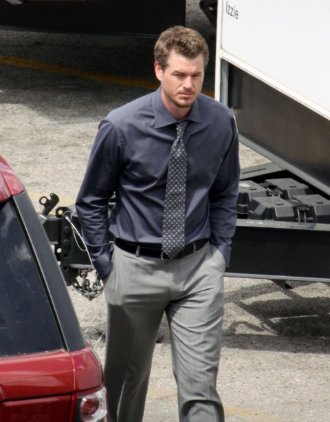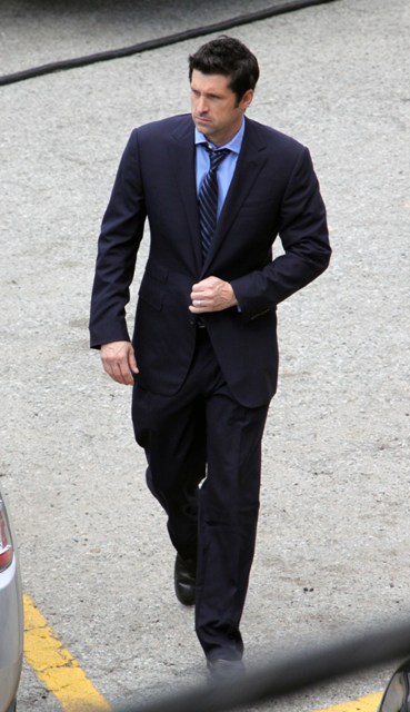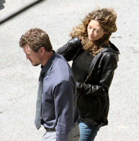 Anyway, if you do care to play photo detective, note that Ellen Pompeo/Meredith is wearing purple underneath that coat. Classic bridesmaid. And something wonderful is going on with Patrick Dempsey’s hair.