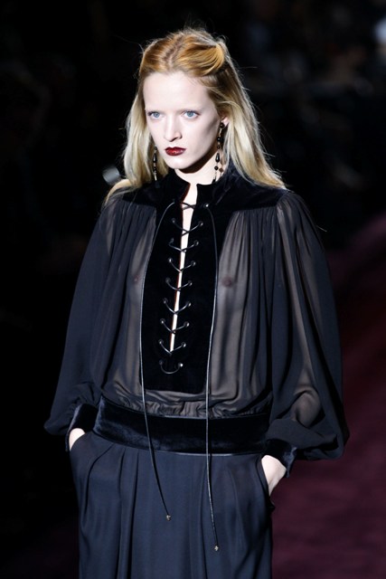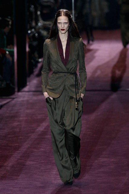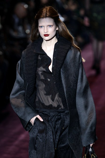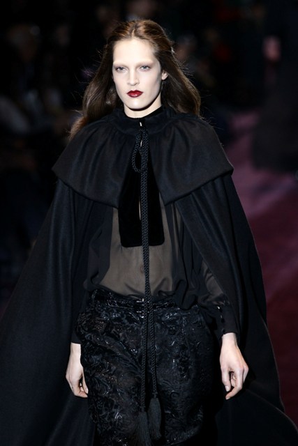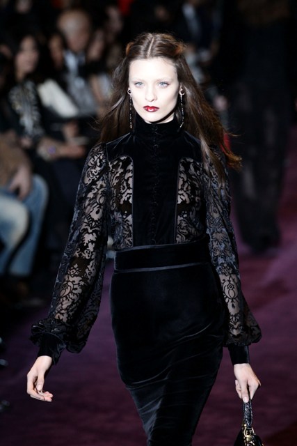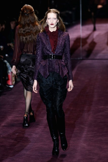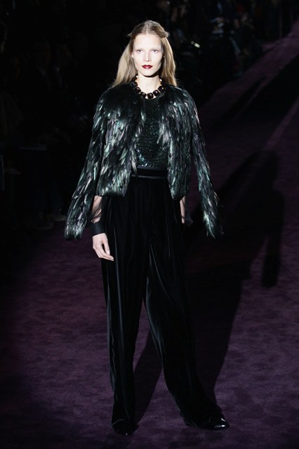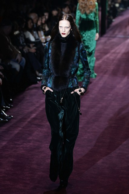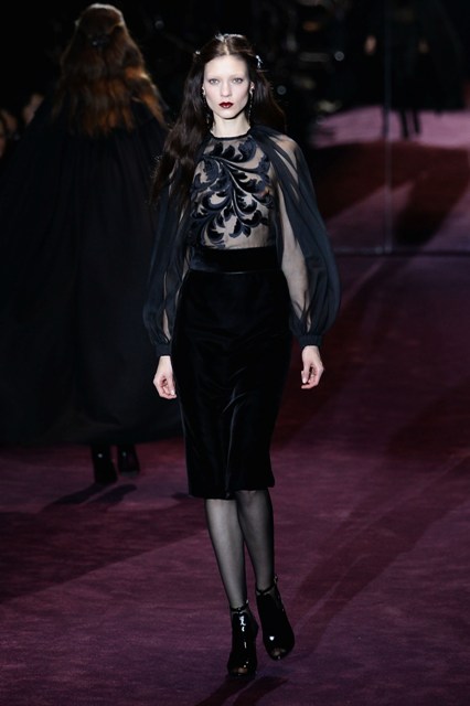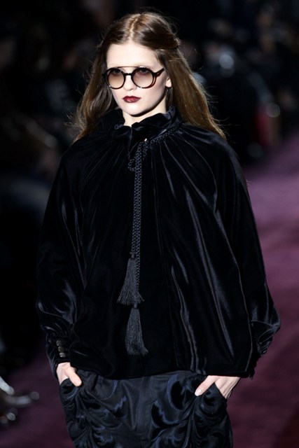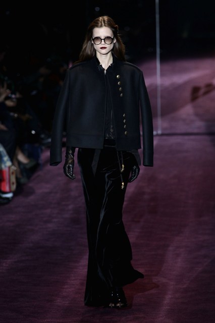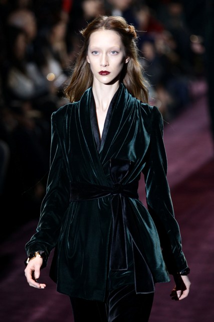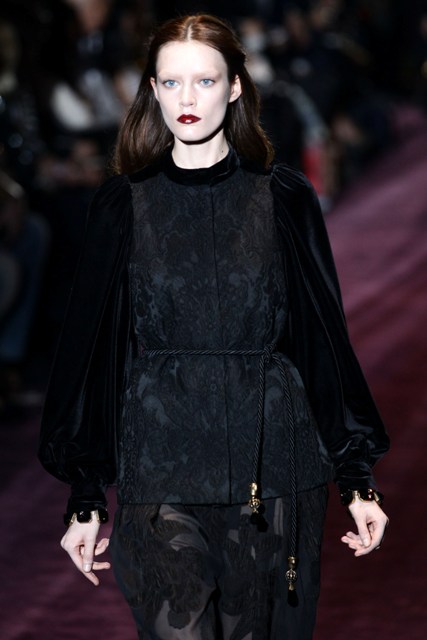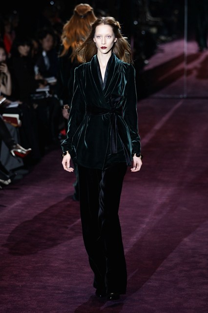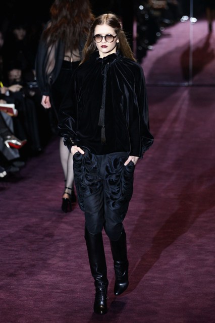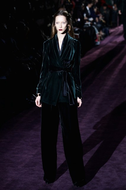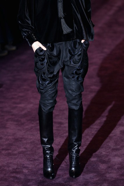 There’s a lot of velvet in this collection. And I LOVE IT. I love all of it. Especially the sheer blouse with the lace overlay – is that how you describe it? How do you wear that if you’re a c cup, even if you have a lot of money? Also those, for lack of a better description, tuxedo riding pants. Please let there be a knock-off soon. These clothes are exquisite.