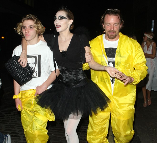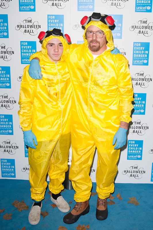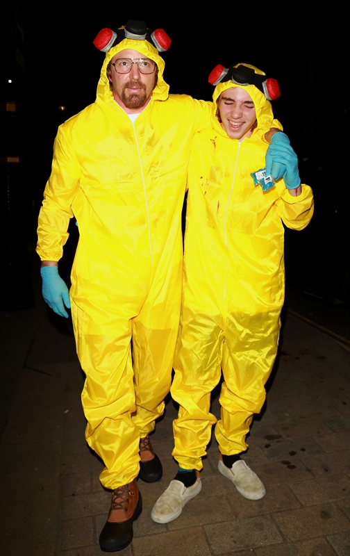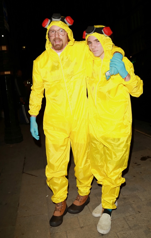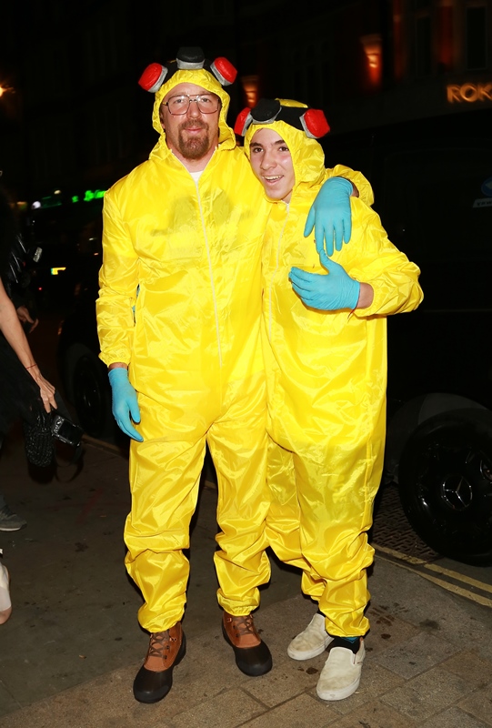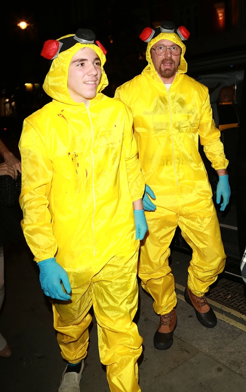Here’s Guy Ritchie last night with son Rocco leaving a fancy dress party, as they call it over there, dressed as Walter White and Jesse Pinkman. You hear about that Florida mom who was all pissy because Toys R Us was selling Breaking Bad dolls? Maybe…just…don’t buy the dolls? It’s not like a 5 year old could afford it.