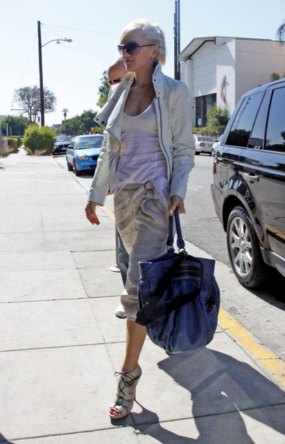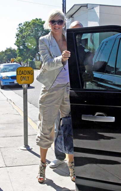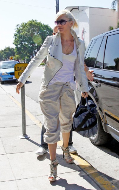 Gwen Stefani arrived at a studio today in LA, as always, immaculately put together. Gwen’s latest spring collection for L.A.M.B. was presented at NY Fashion Week a few days ago, this season a heavily 80s inspired theme that featured the harem pants she’s been wearing so often lately and also acid wash and studs, well tailored jackets, and some really great accessories. There’s a hot pink bag with black accents that’s the perfect size. And not super expensive. According to MTV, the line ranges from $45 - $350. Am assuming this doesn’t include the bag.