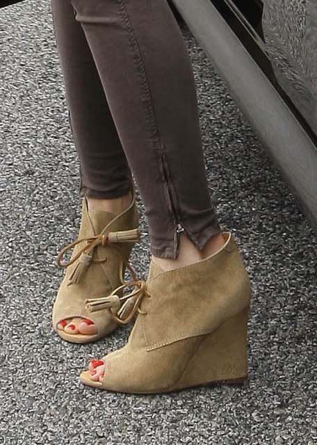 I don’t think so. Not if it’s done like Gwen Stefani. Yesterday she was wearing a striped halter maxi with an exposed bra - click here for a refresher. Today it’s a sweater with brown skinnies and suede wedges. I love how high the neckline is on this shirt and the way it clings.