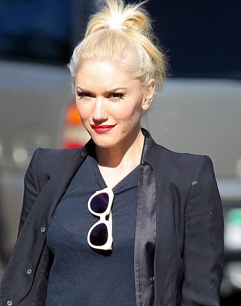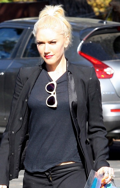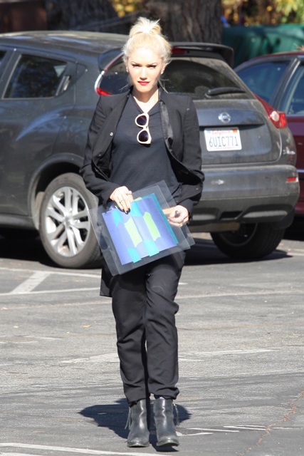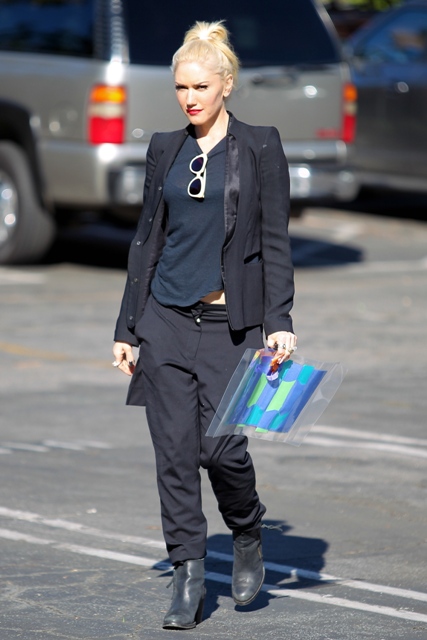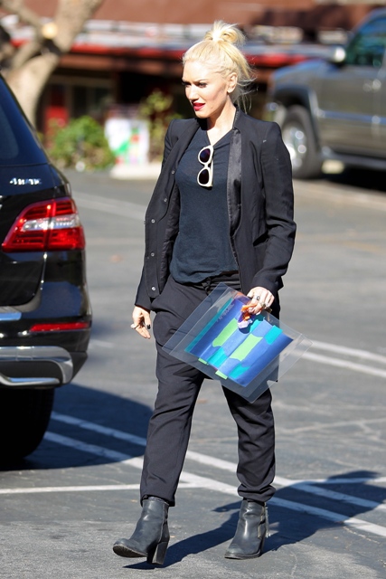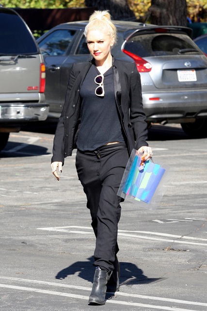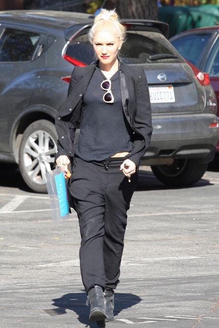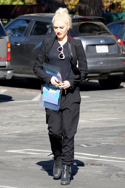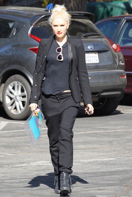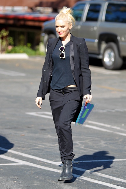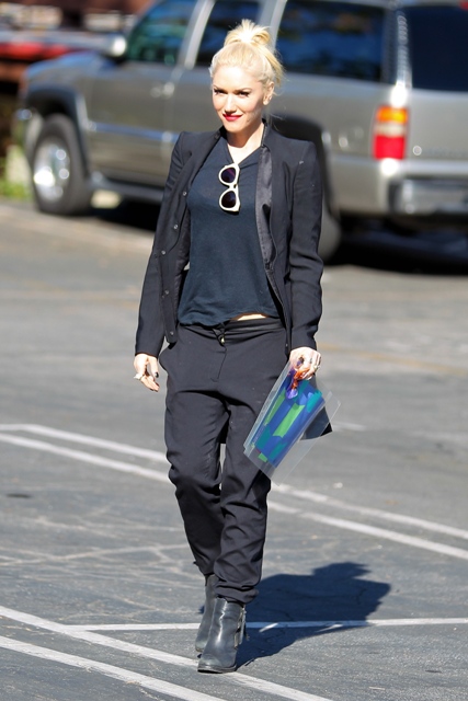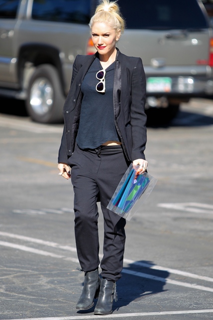 Messy bun, baggy-ish pants that still look pretty cute shoved into boots, and a well fit black blazer with a great trim, and maybe some stains on the shoulder. This is what happens when Gwen Stefani just “grabs whatever clothes are just lying around” which, um, I would totally wear on a nice night out.