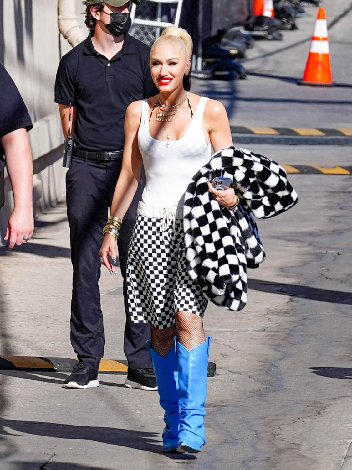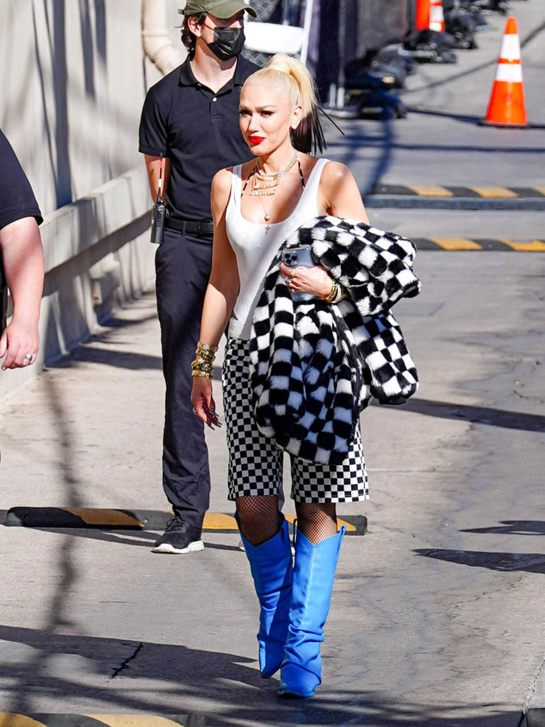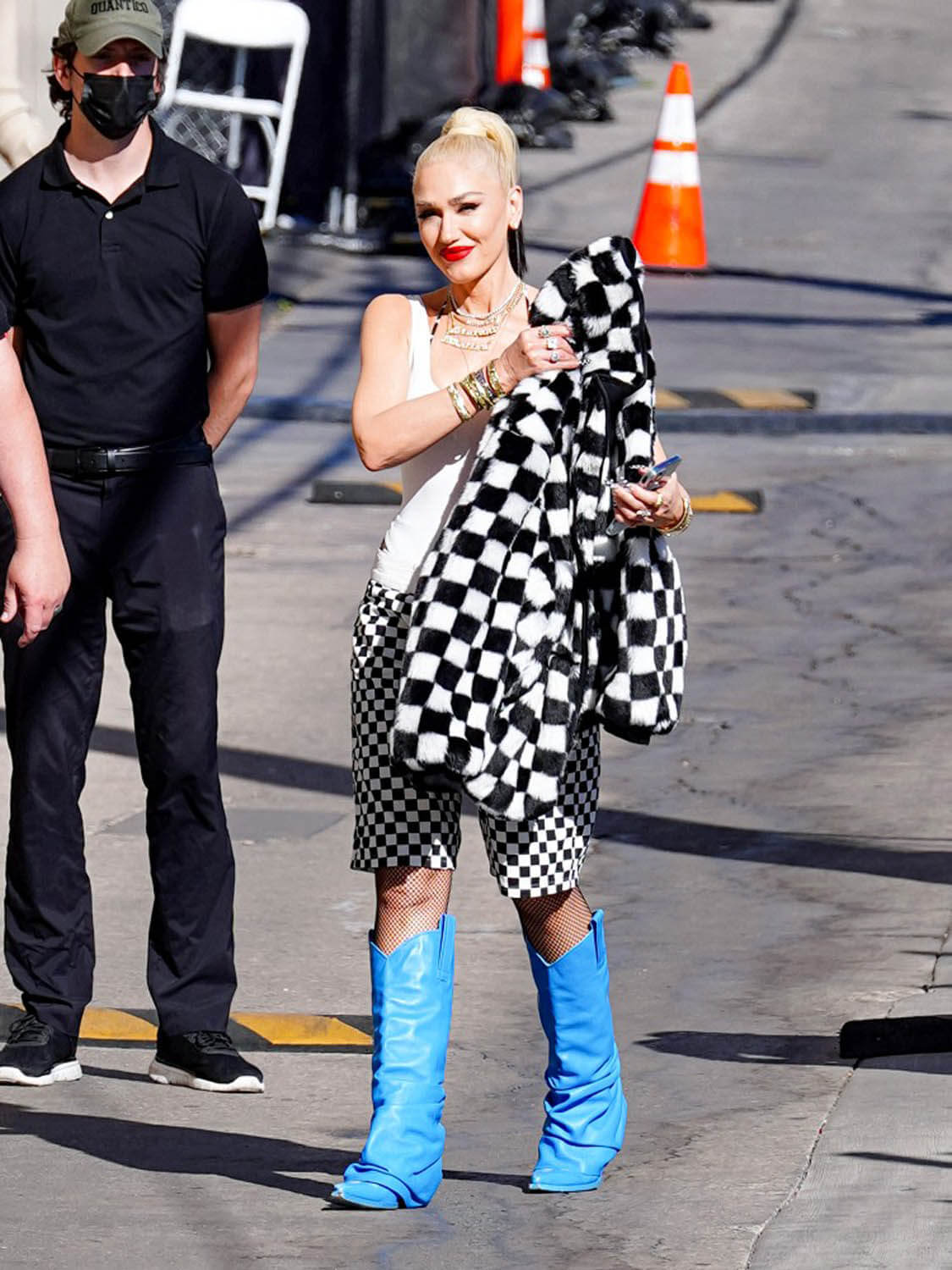 Anyway, blue was the colour of Gwen’s boots last night on Kimmel, paired with a classic Gwen Stefani print – black and white checkers, like Vans. This look is excellent – the bomber, the matching sport shorts, a bodysuit underneath, and you’ll note, if you go in tight, even her bra is the same print. Now I’m on the hunt for a check-print bralette. Five minutes later, just found one. Guess who makes it? Vans, of course!