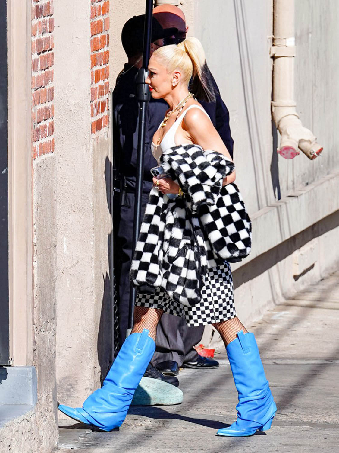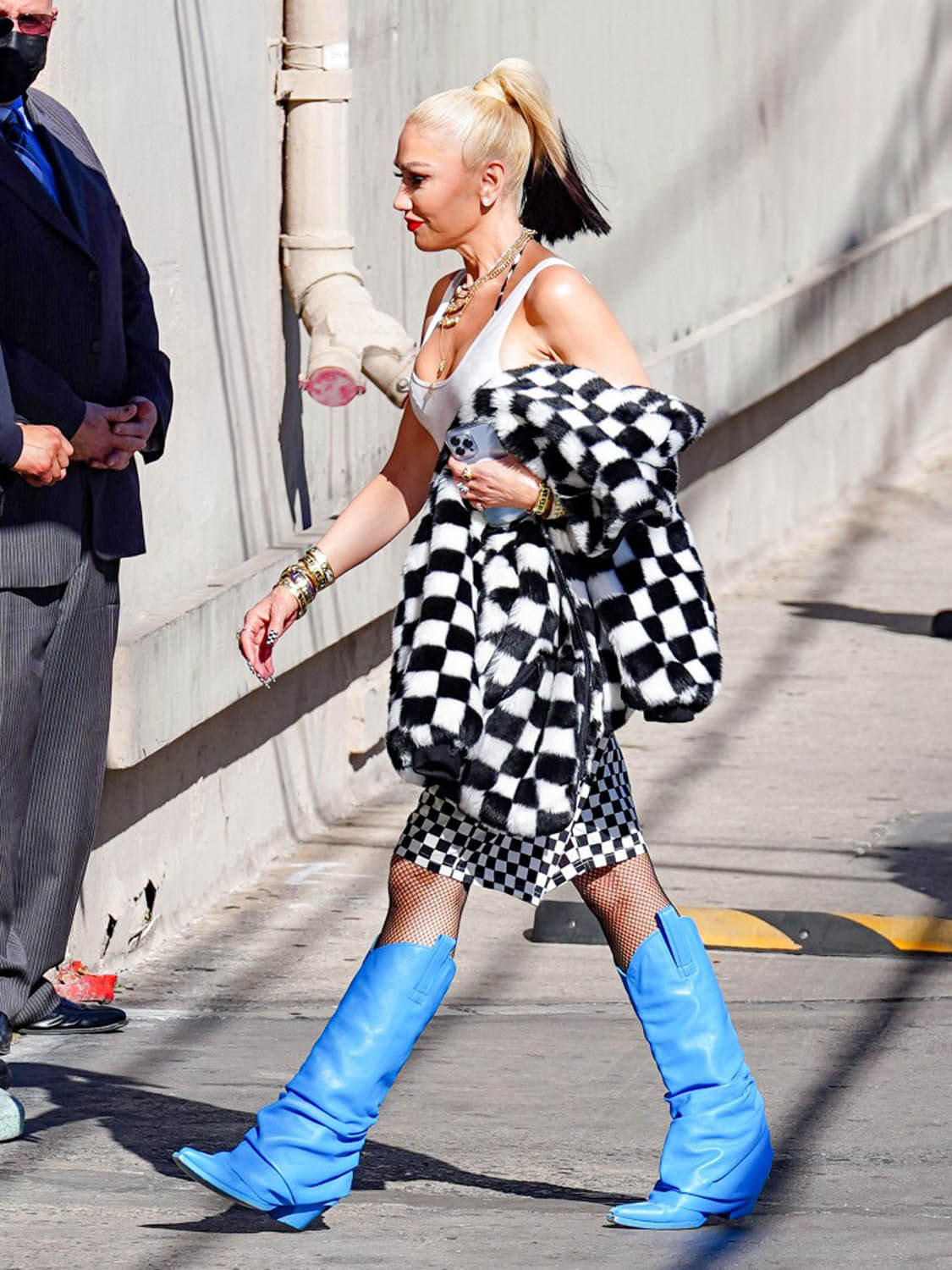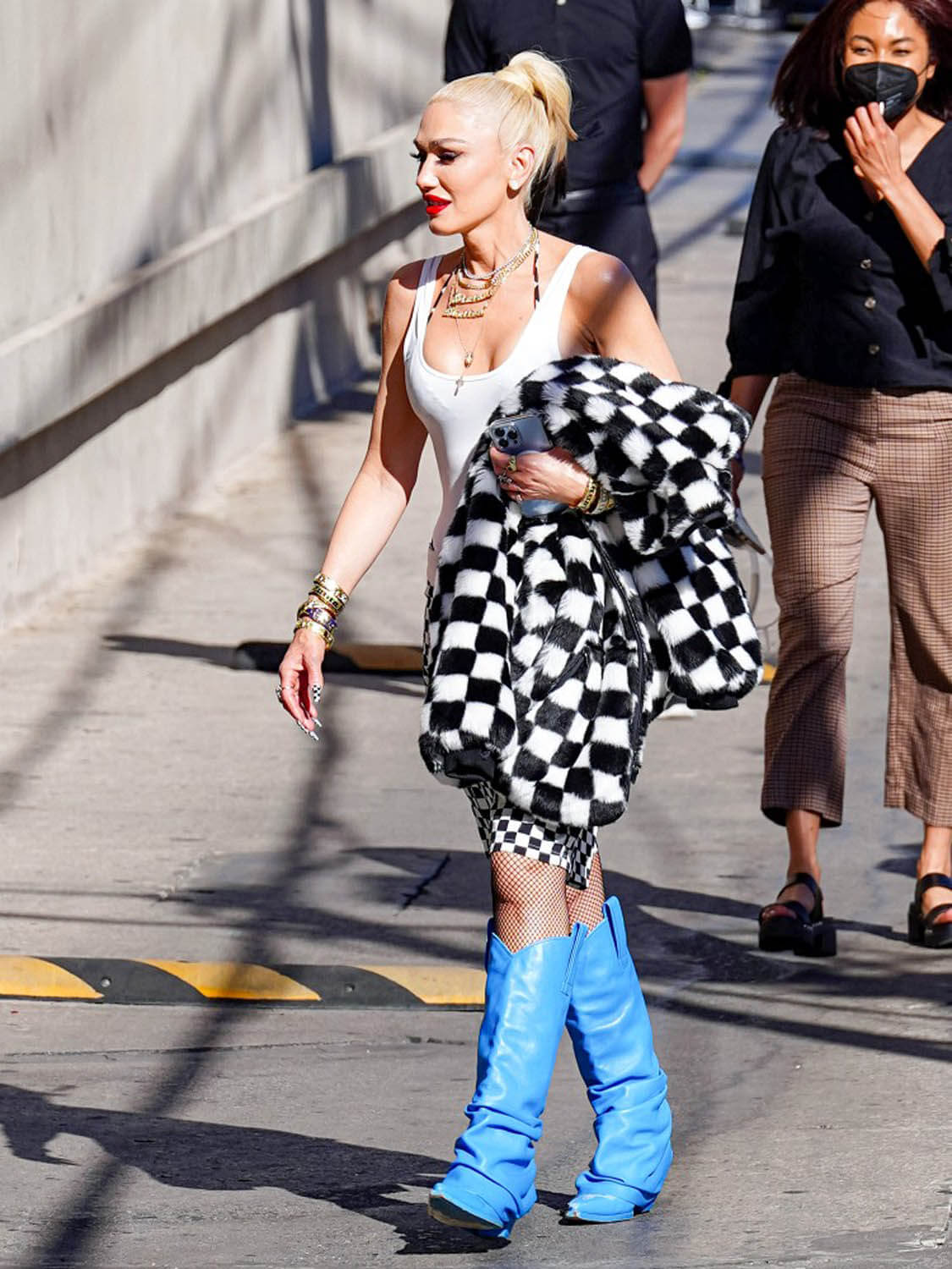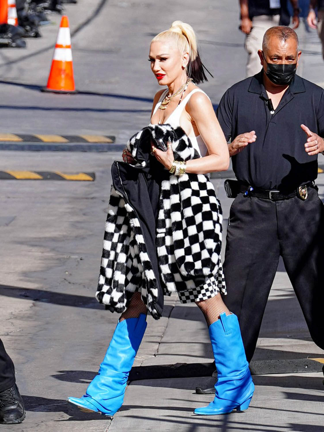 Anyway, blue was the colour of Gwen’s boots last night on Kimmel, paired with a classic Gwen Stefani print – black and white checkers, like Vans. This look is excellent – the bomber, the matching sport shorts, a bodysuit underneath, and you’ll note, if you go in tight, even her bra is the same print. Now I’m on the hunt for a check-print bralette. Five minutes later, just found one. Guess who makes it? Vans, of course!