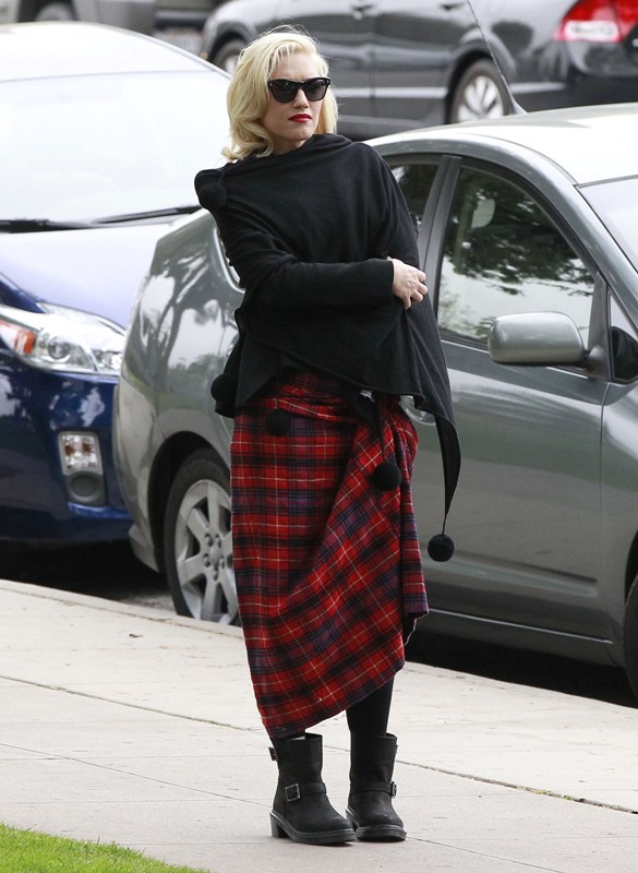 Can’t decide how I feel about this gauzy white dress over jeans but I do like the high cut back of her coat. Also love the pompoms on the ends of her black wrap that she wore over a long red plaid skirt.