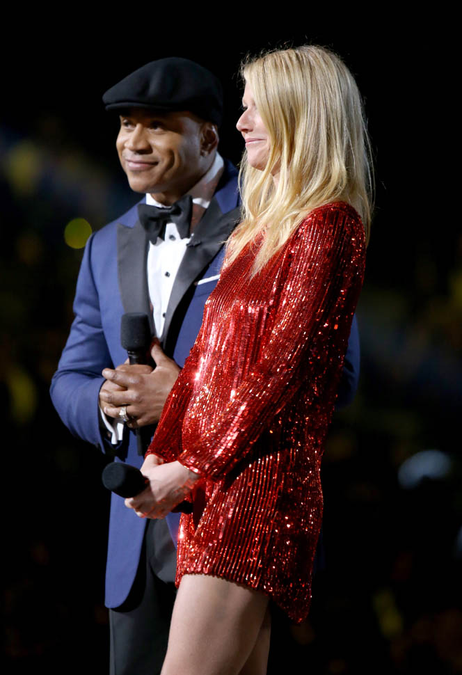 It seems like these two are never not together. Gwyneth Paltrow presented. Chris Martin performed. And you can see him I think in the background of one of these shots of her.