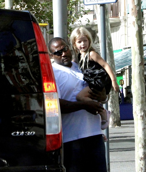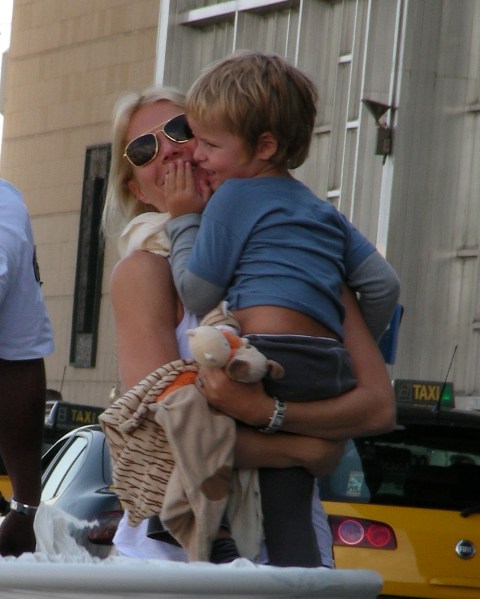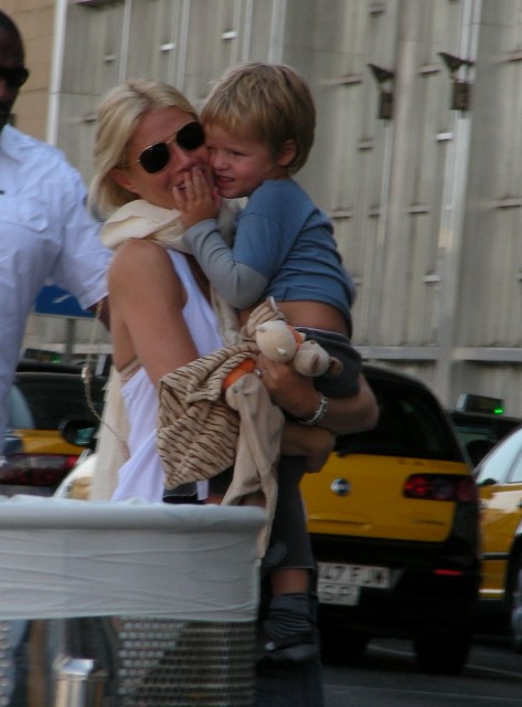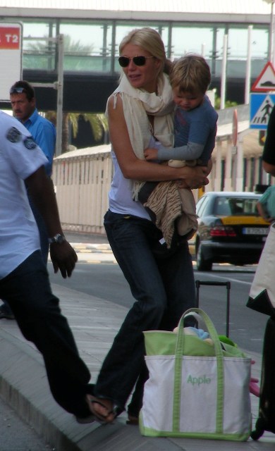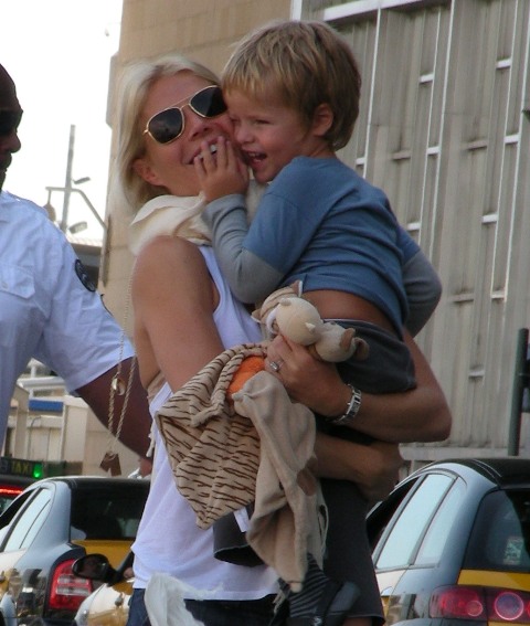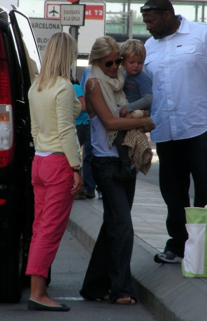 Here’s Chris Martin out and about on Sunday with Apple and the bodyguard. And then Gwyneth at the airport heading out with Moses. I did not receive the personal notecard she sent out to all her friends informing us that he’d cut his hair.