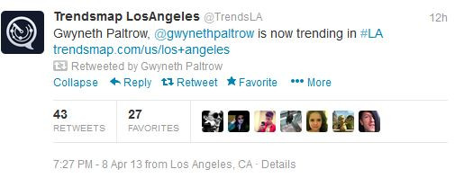 Anyway, the point is Apple Martin and her friends choreograph routines and rehearse their moves to Demi Lovato music. And her ma Gwyneth, like a Twi-Hard, cornered her in the airport lounge for a picture. And when she posted the picture, because Demi Lovato fans are so active on Twitter, Gwyneth’s Twitter account started trending in LA, according to Trendsmap.