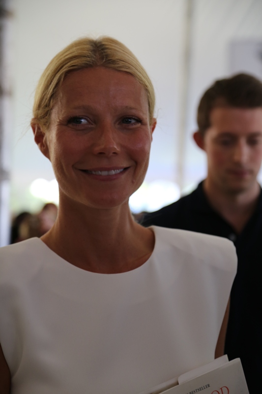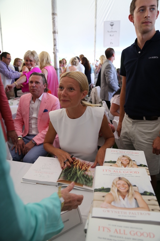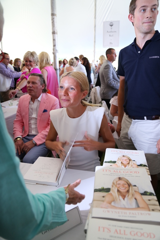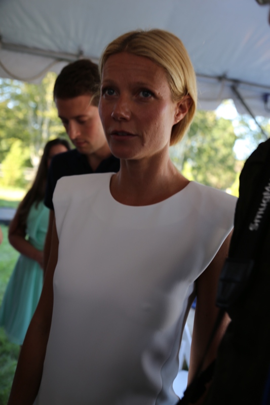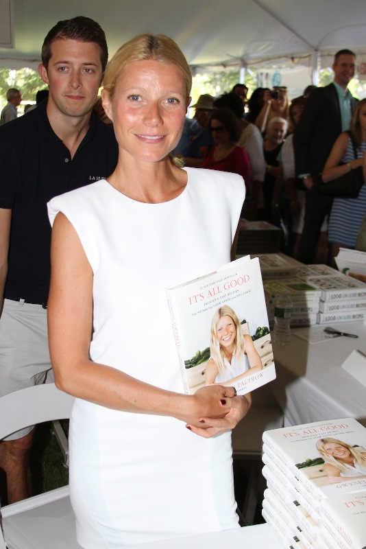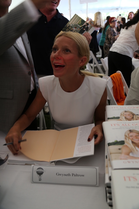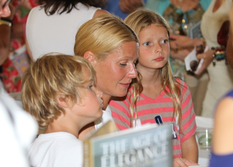 As mentioned last week, Gwyneth Paltrow and her family are spending August in the Hamptons. Click here for a refresher. On Saturday G lit up the Hamptons social scene not as an “actor” but as a “writer”, showing up for the Authors Night For The East Hampton Library event. Her husband Chris Martin (not pictured, no pictures anyway) and children, Apple and Moses, were with her for part of the day and the kids didn’t seem to want to leave her, even when she was at the signing table. At one point she leaned over and kissed her son. Cute, right? Later on that night, G let her hair down and put on some heels. I like that she’s barely wearing any makeup and didn’t bother to do her hair. Is this the Hamptons way? Also, are Asians allowed to buy homes in the Hamptons? I keep eyeballing the background of all these pictures and can’t seem to find any. Asians are driving up home prices all over the world. Would people in the Hamptons have a problem with that?
