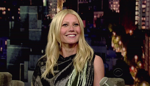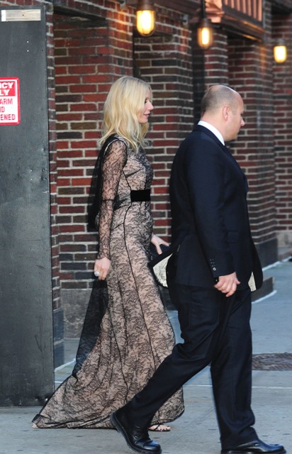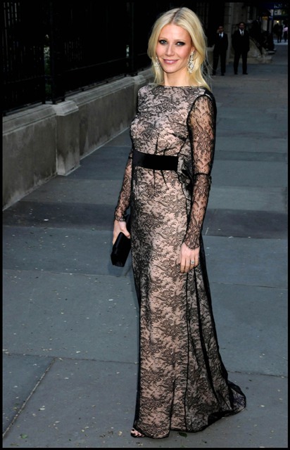 There were 3 clothing changes for Gwyneth Paltrow yesterday. First a casual-ish blouse and black shorts with big heels upon arriving at Letterman. Then a sheath on Letterman. And then a long lacy looking dress for the Chopard party immediately afterwards. The first two were rather unremarkable. The final choice however...