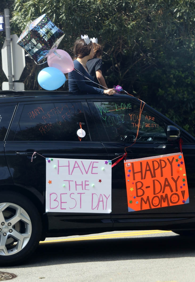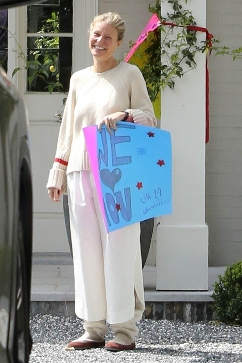 Gwyneth Paltrow’s son, Moses, is now 14. Since LA is on lockdown, his friends came by the house with their parents, and wished him happy birthday. The Range Rovers circled G’s driveway and made signs and the kids hollered out the windows – she posted it on her Instagram stories and this carousel on her feed. Where did the time go? He’s 14!