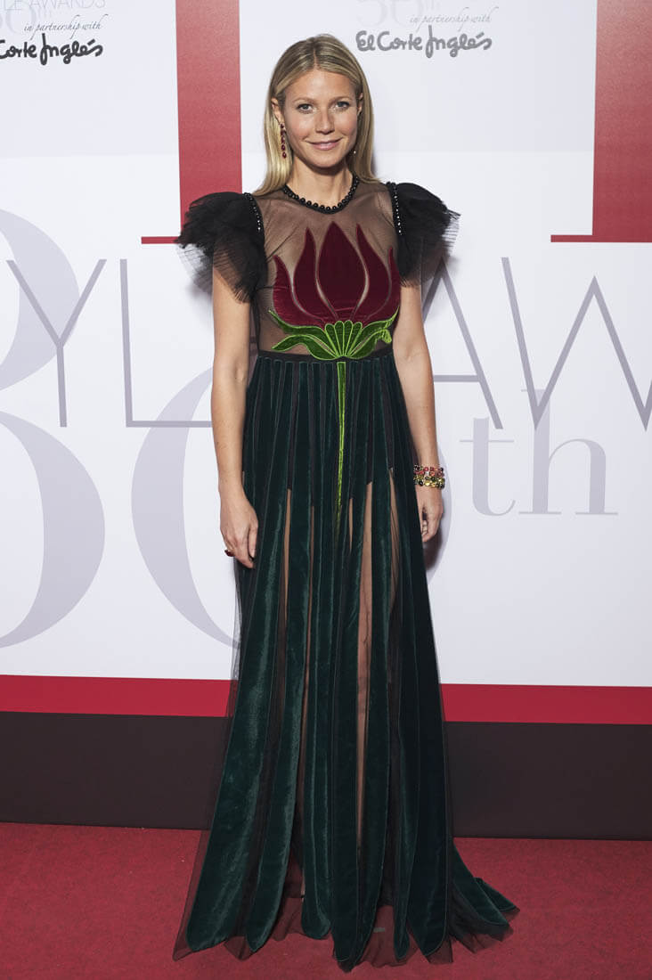 Gwyneth Paltrow was in Madrid last night at the ELLE Magazine 30th anniversary party where she was presented with the Icon Award. G wore Gucci. And this dress… it’s amazing. It’s a rose growing out of her vulva and blooming all over her breasts. Which, I mean I just can’t wait for her to tell me that it’s a symbol of her entrepreneurial creativity, living inside of her for so long, and only now able to extend outwards, to be shared. Here’s G accepting her award in Spanish: