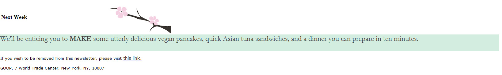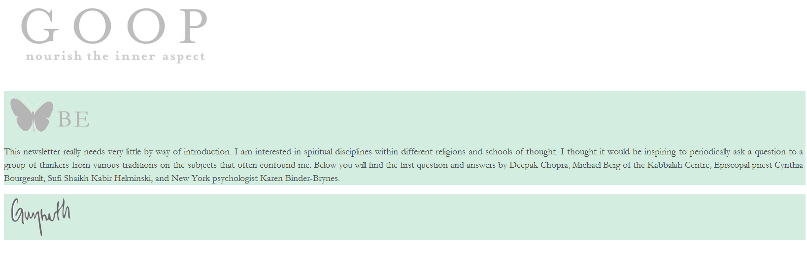 My GOOPster’s latest newsletter has arrived! Thanks to all of you for forwarding it. I’m still not a member. And this week is a perfect example of why not.