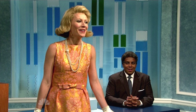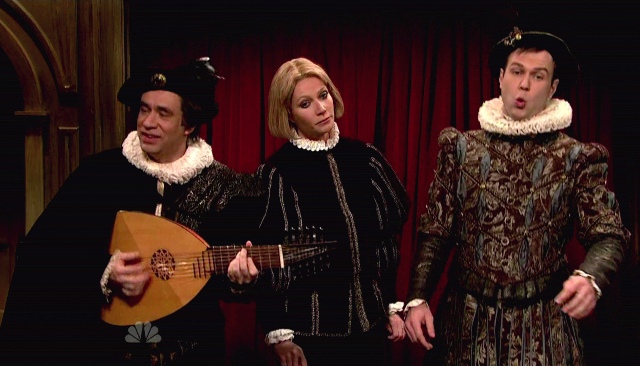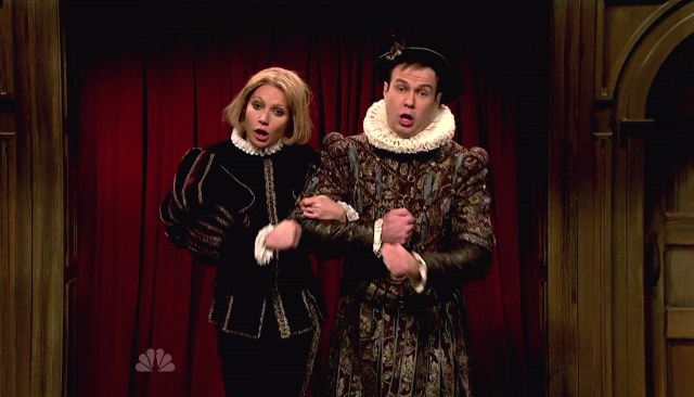 Having said that, there were a few winners. I liked the “Forget You” introduction. And while the Game Show sketch was very weak, I liked her socialite drawl as Titsy Titseyton, or whatever her name was. Rich people come up with the dumbest names and nicknames. G was, in that routine, who we think she is. The kind of girl who knows where to go for the best crème fraiche and doesn’t understand why anyone else would want crème fraiche from anywhere else. Previews during Shakespeare wasn’t bad either.