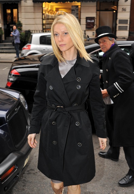 Today in London, wearing a black trench and bare legs, G stepped out in a brand new pair of nude gladiator booties with … a built-in sock? Definitely not for the MiniVan, hell no.