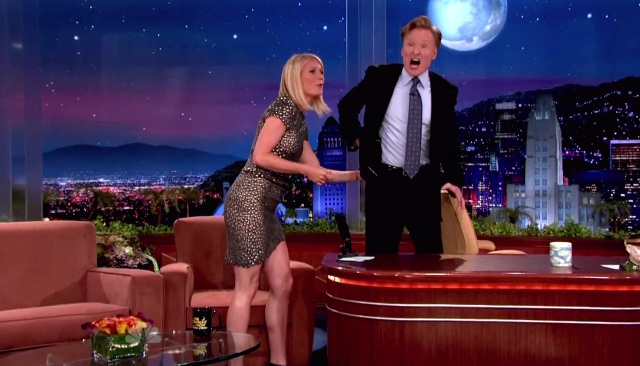 Never mind. The video is below – two parts. The section in particular that has the bumpwatchers buzzing is during the 2nd, when G stands up to help Conan work out his glutes.