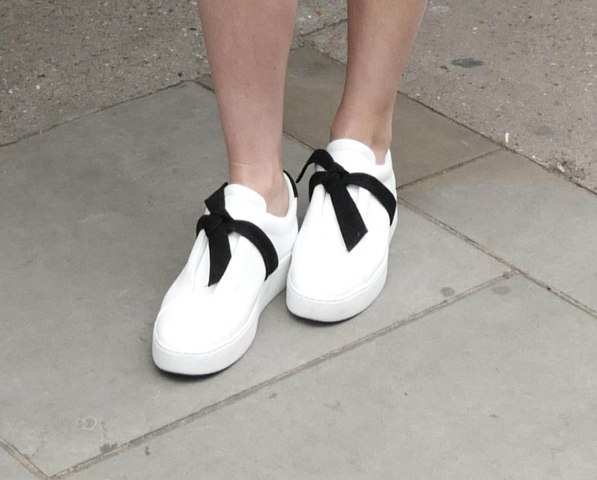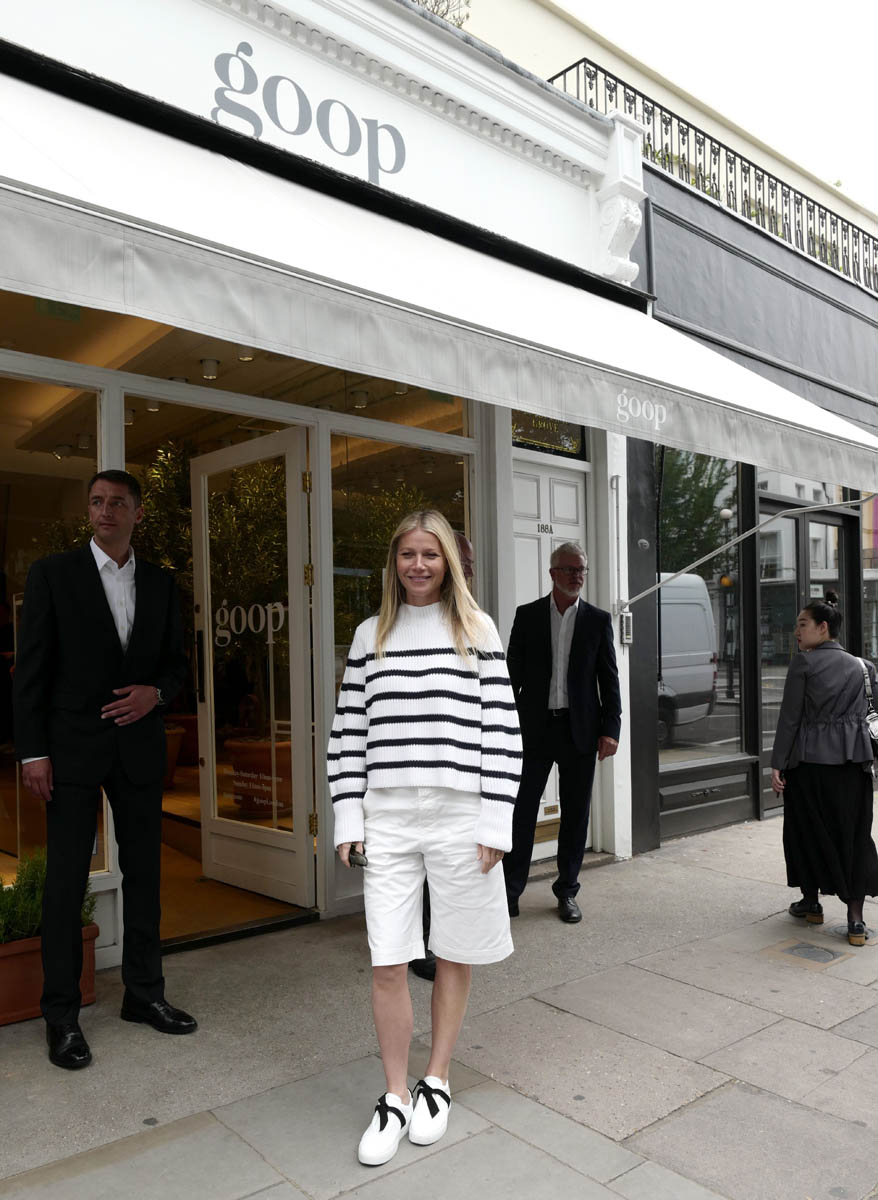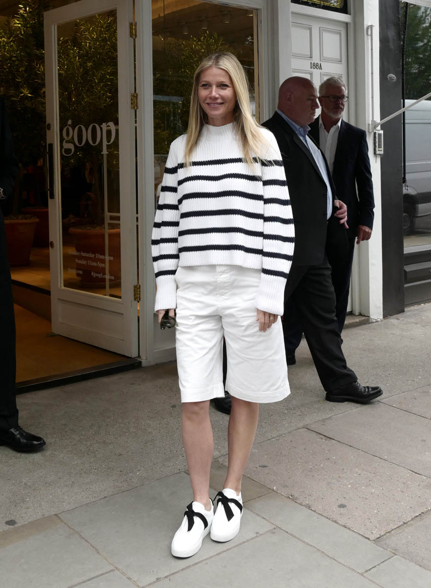 Let’s focus on Gwyneth for now, seen here in London promoting her book. I am OBSESSED with this outfit. We’ve seen her in a variation of this before – and she’s always looked great in stripes – but it’s the combination of this perfect striped top (the length of it, and the shape too, falling to the exact right spot on the waist) over these shorts. And the sneakers with the ribbons. Seriously. Why is she so good at sweaters?