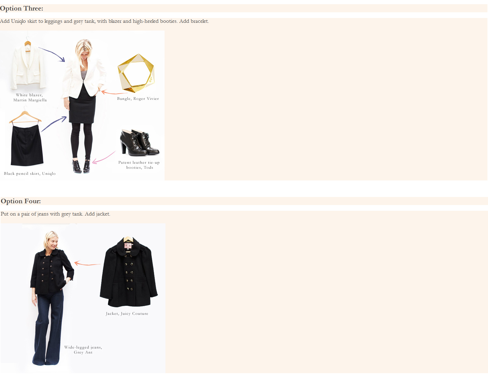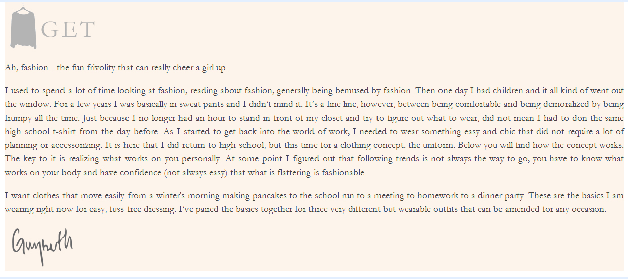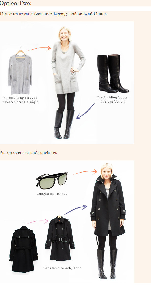 This is Gwyneth’s “uniform”. A series of clothing options for the busy mom – she says she lives in these combinations for comfort and style…