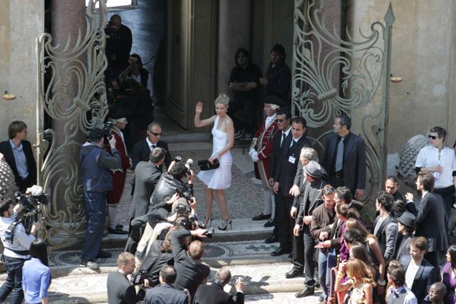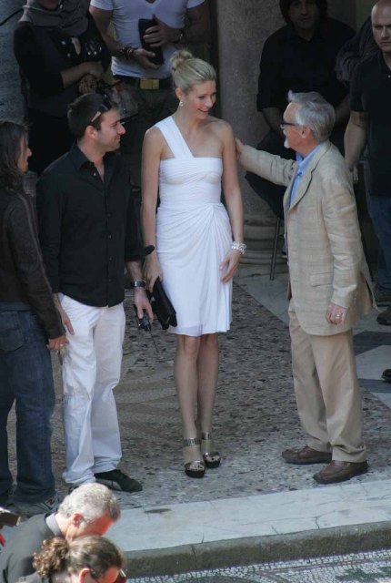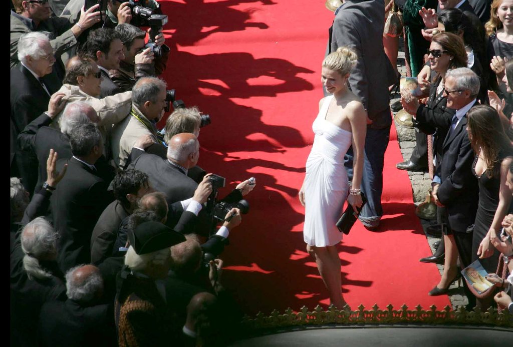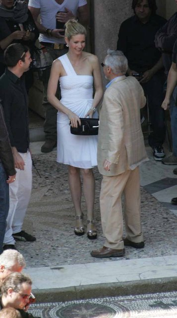 Gwyneth Paltrow is pictured here shooting a commercial in Rome today wearing a gorgeous white dress on a red carpet crowded with paparazzi and a carriage waiting her for at the end of the line. In some shots she can be seen before entering her palace turning around and waving to her subjects.