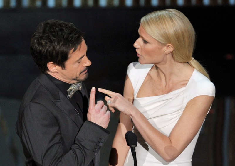 I’m attaching shots from Gwyneth and RDJ at the Oscars in 2012 where they presented together and they did that whole bit about being in a documentary and while it was planned, of course, but it was also a play on Pepperony Porn. Click here to revisit the clip.