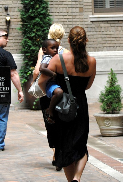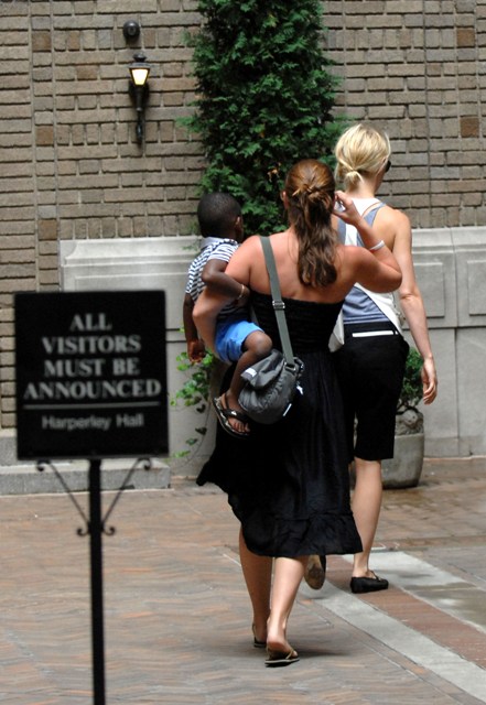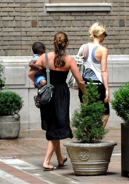 My Gwyneth, followed by baby David Banda and his nanny, showed up yesterday at Madonna’s apartment for a visit and some girl support. Maybe even a tongue kiss. According to the tell-all being peddled by her brother, Madge and Gwyneth necked one night in front of a roomful of people at a party.