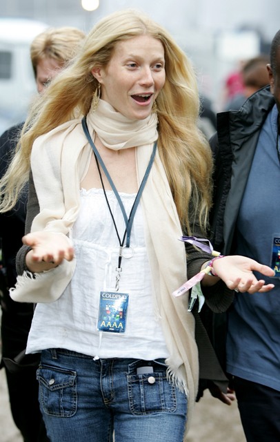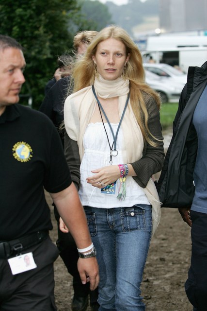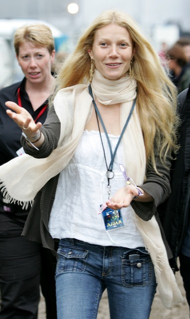 Glastonbury 2005. A fresh faced, long haired Gwyneth, a year after the birth of Apple, showed up for Coldplay. I love these pictures. I was the only one who liked her straggly mane. Looking at it now, I still do.