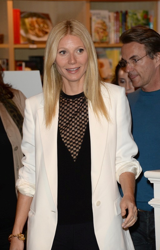 Gwyneth Paltrow was at Williams-Sonoma on Friday to promote It’s All Good. She wore a white blazer over The Legs. Note the length of the blazer -- 80s, non? I like it.