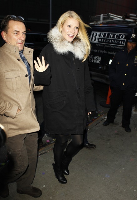 This morning however Gwyneth had an appointment with Good Morning America to promote Country Strong, opening wide on Friday. Here she is arriving at the studio, fresh faced and perky, doing her best to support a film that has received weak reviews. This does not bode well for my Garrett Hedlund quiver. As already noted here last week, after seeing his bad acting in TRON and his thigh thickness too, I’m relying on Country Strong to redeem him. Am losing confidence fast.