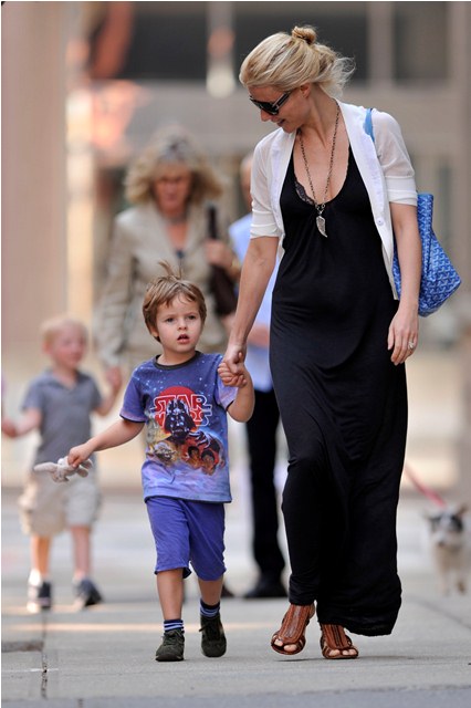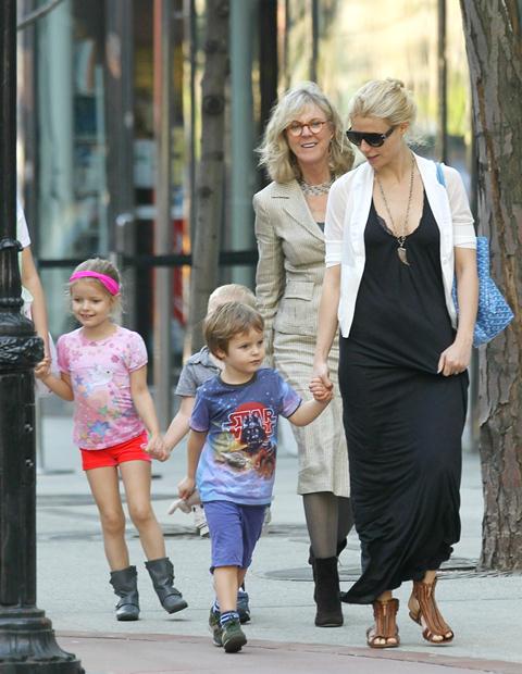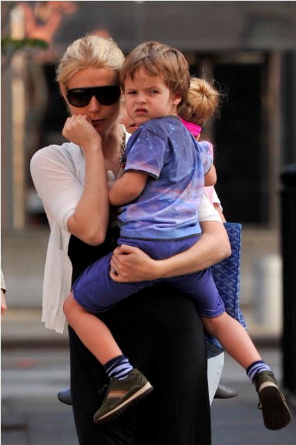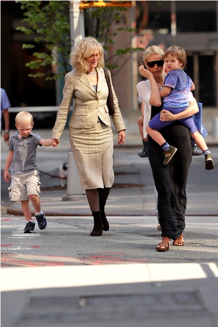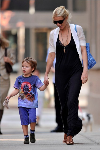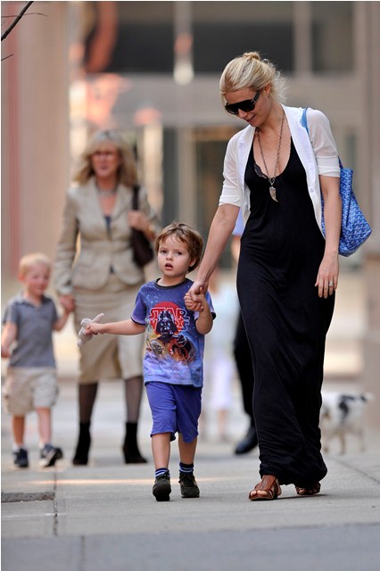 Here’s Gwyneth Paltrow with her mom Blythe Danner and her son Moses out for a walk today. As you can see, Moses is a Star wars fan. Very cute.