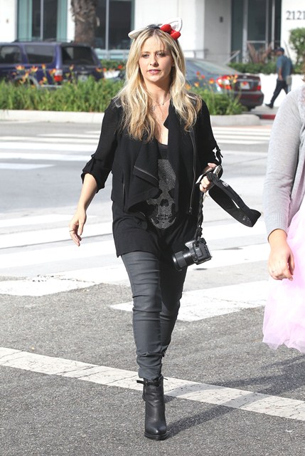 Sarah Michelle Gellar at her daughter Charlotte’s school today with ears and a skull shirt.