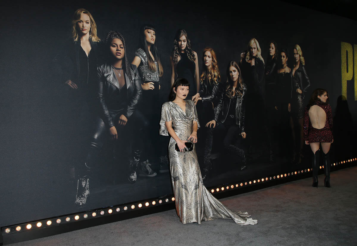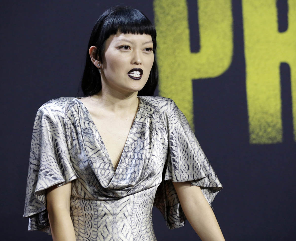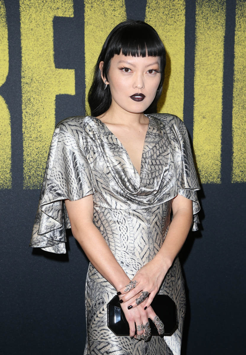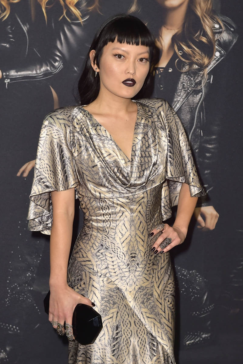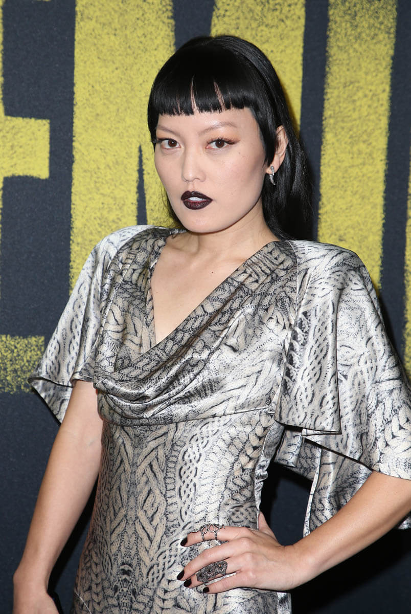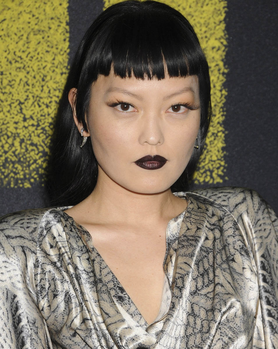 Hana Mae Lee is wearing a “classic” dress. I don’t know what the word for it is but it’s been around forever – longish flutter sleeves, material loosely dropped across the chest, fitted through the torso, and bias to the bottom. It’s gorgeous. And it’s gorgeous on her in this silver print, all finished off with a stroooonggggg lip, and an even stronger hairstyle.