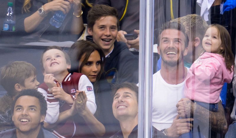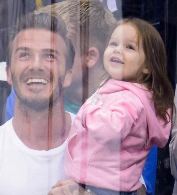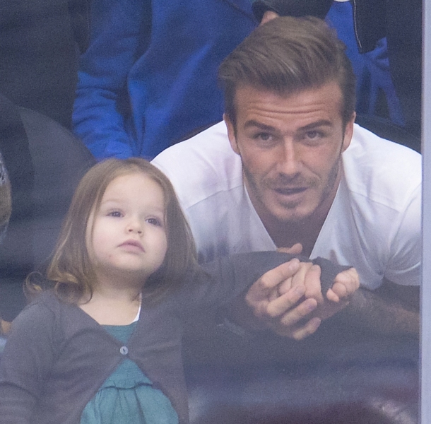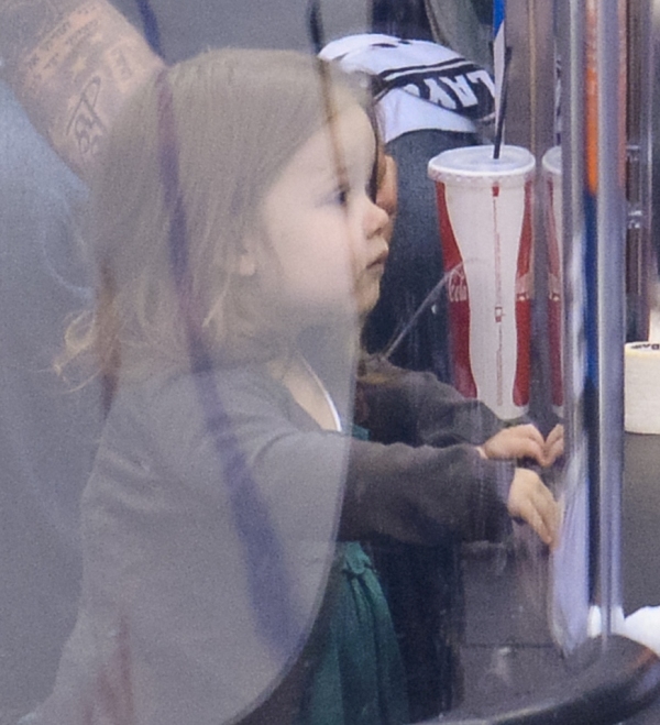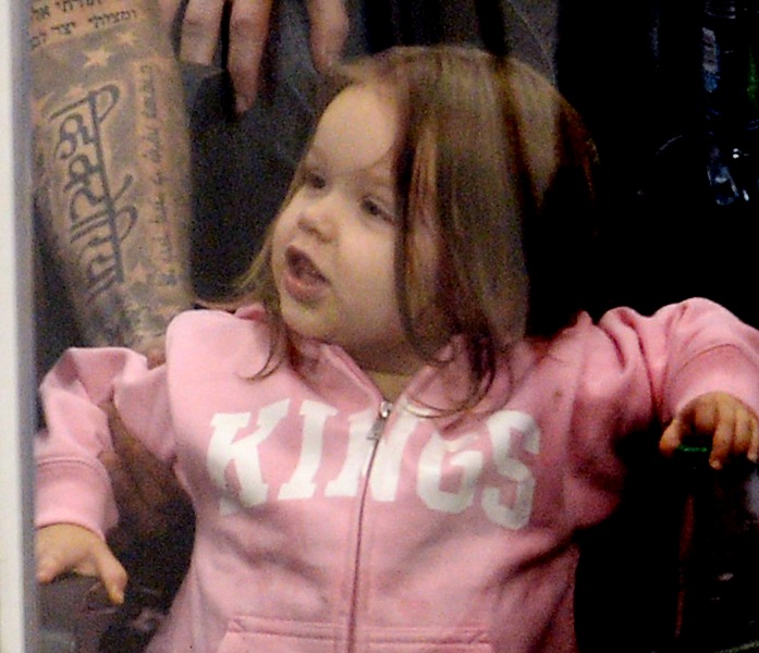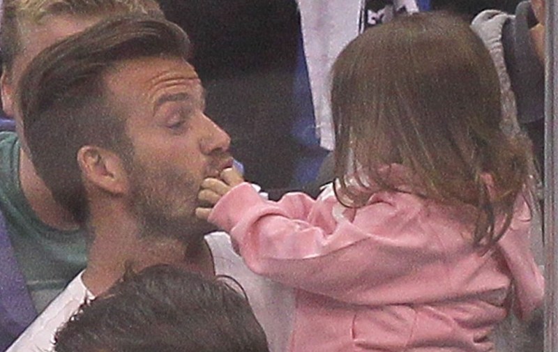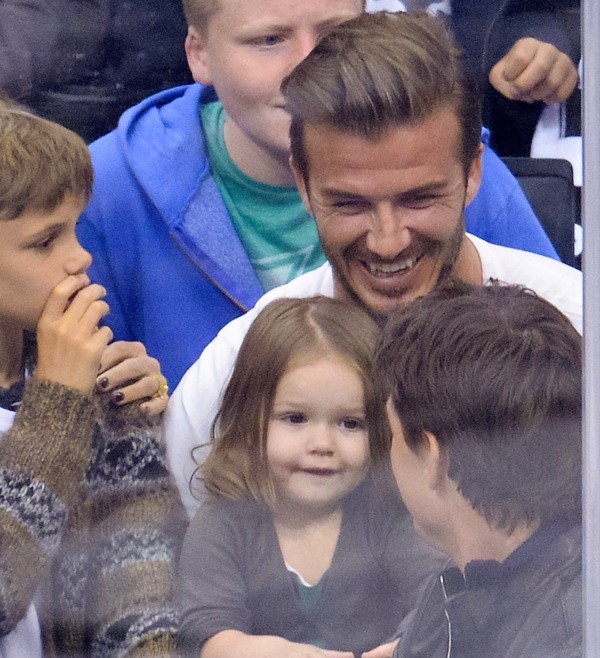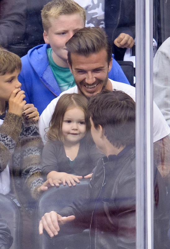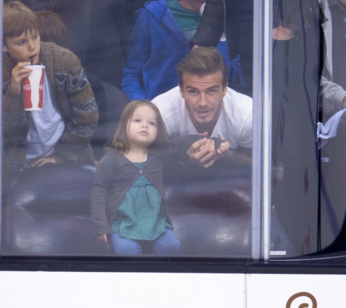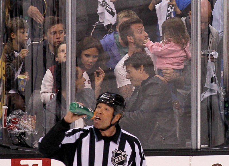 The Beckhams hit up Game 7 last night between the San Jose Sharks and the Los Angeles Kings. Nothing quite like the stress of a Game 7, especially when you have to book it out of the building before the mob lights your car on fire. But this is LA and not Vancouver and, besides, the Kings won. With their new little mascot cheering them on.