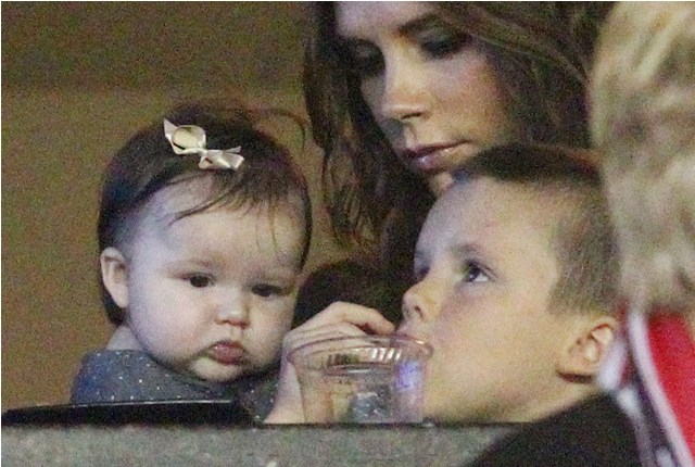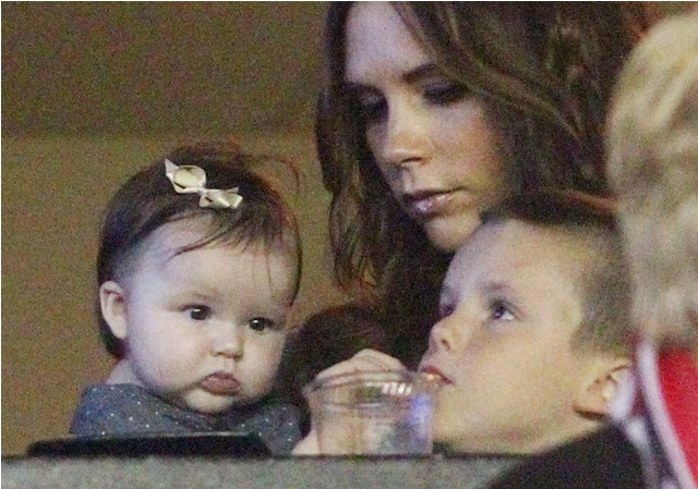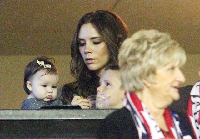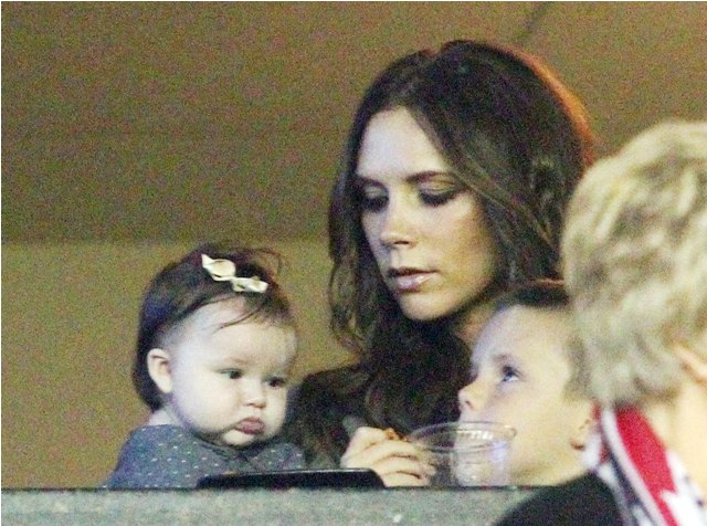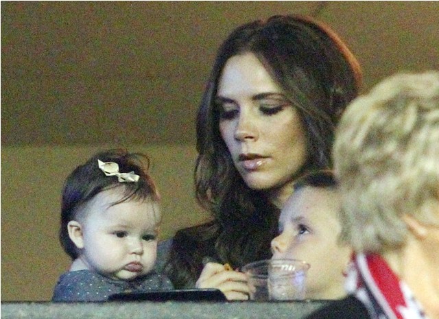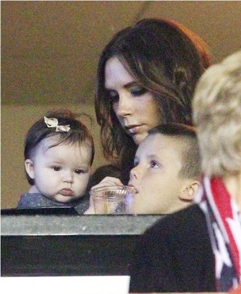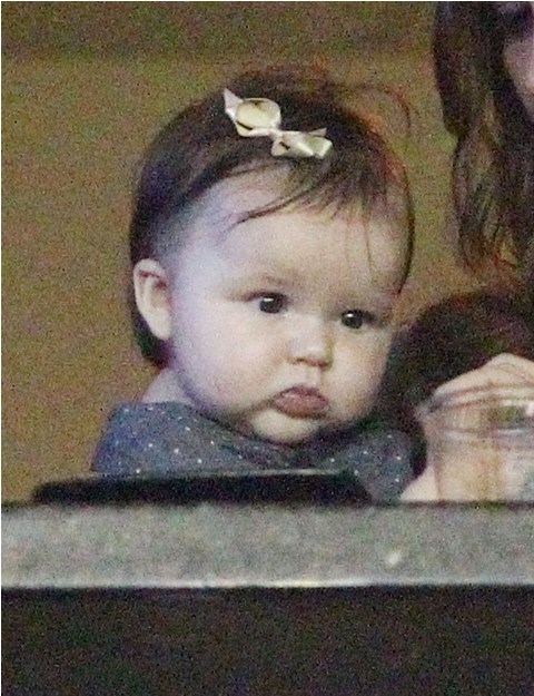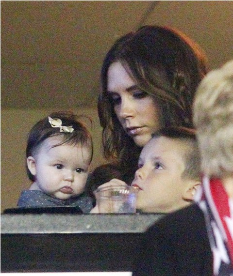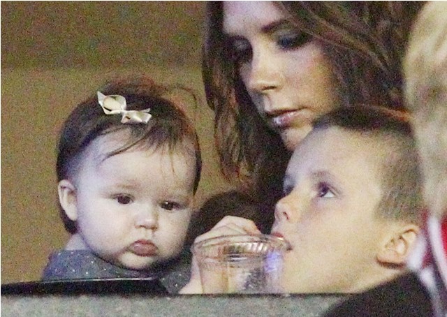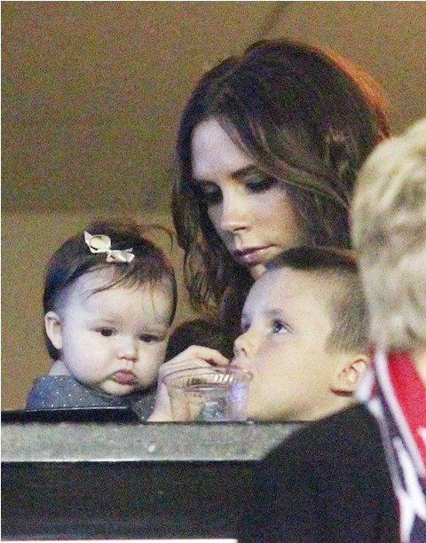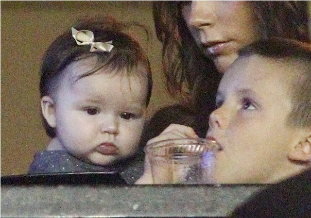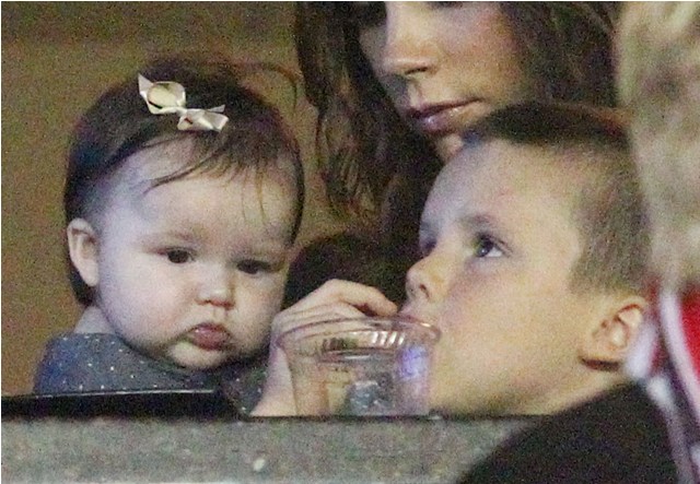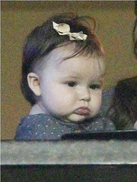 But last night she played the part of cheerleader, keeping an eye on H7 in the private box while her boys celebrated the victory with dad. Even I can’t deny how delicious that baby’s cheeks are.