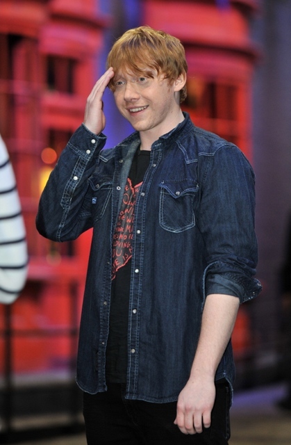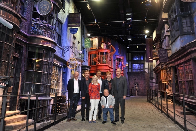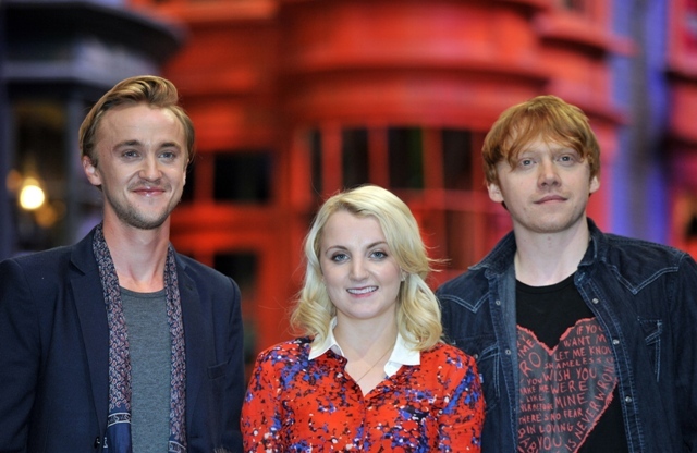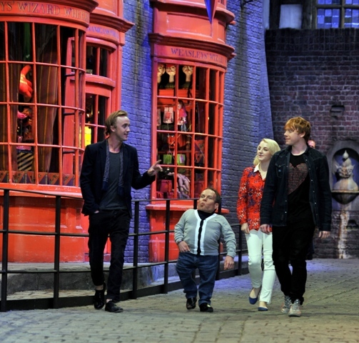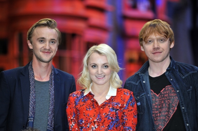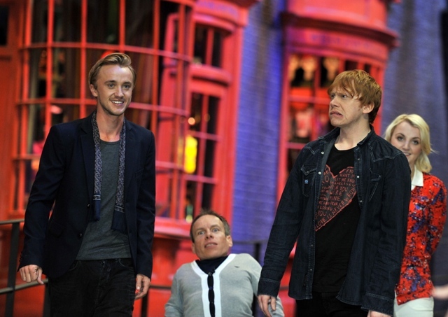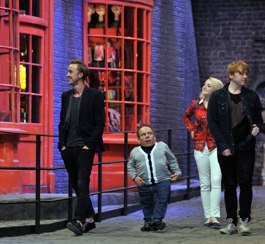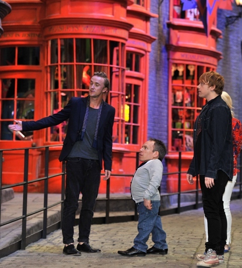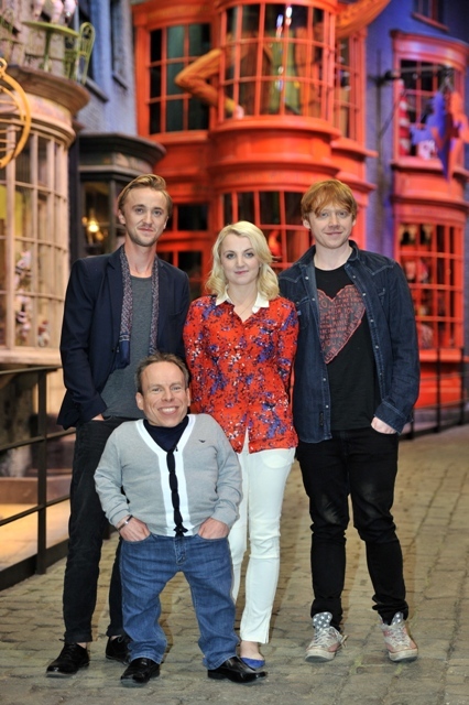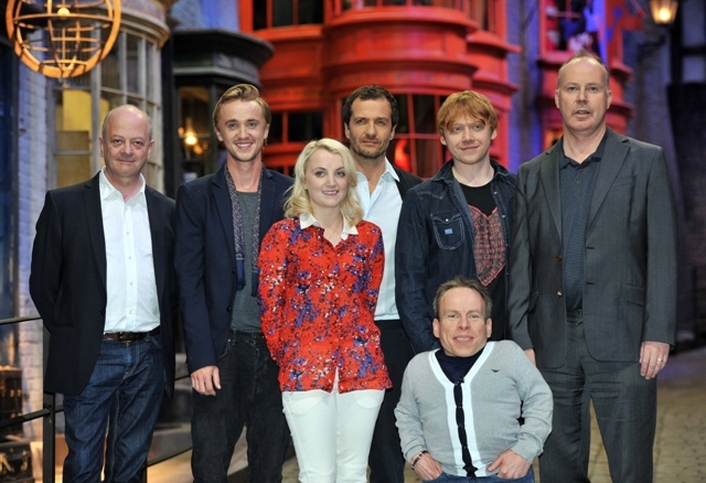 Rupert Grint (Ron Weasley), Evanna Lynch (Luna Lovegood), Warwick Davis (Prof Flitwick), Tom Felton (Draco Malfoy), and director David Yates attended a photo call at Leavesden Studios today to open the Warner Bros Making of Harry Potter studio tour. Where’s NEVILLE?????????????????????????